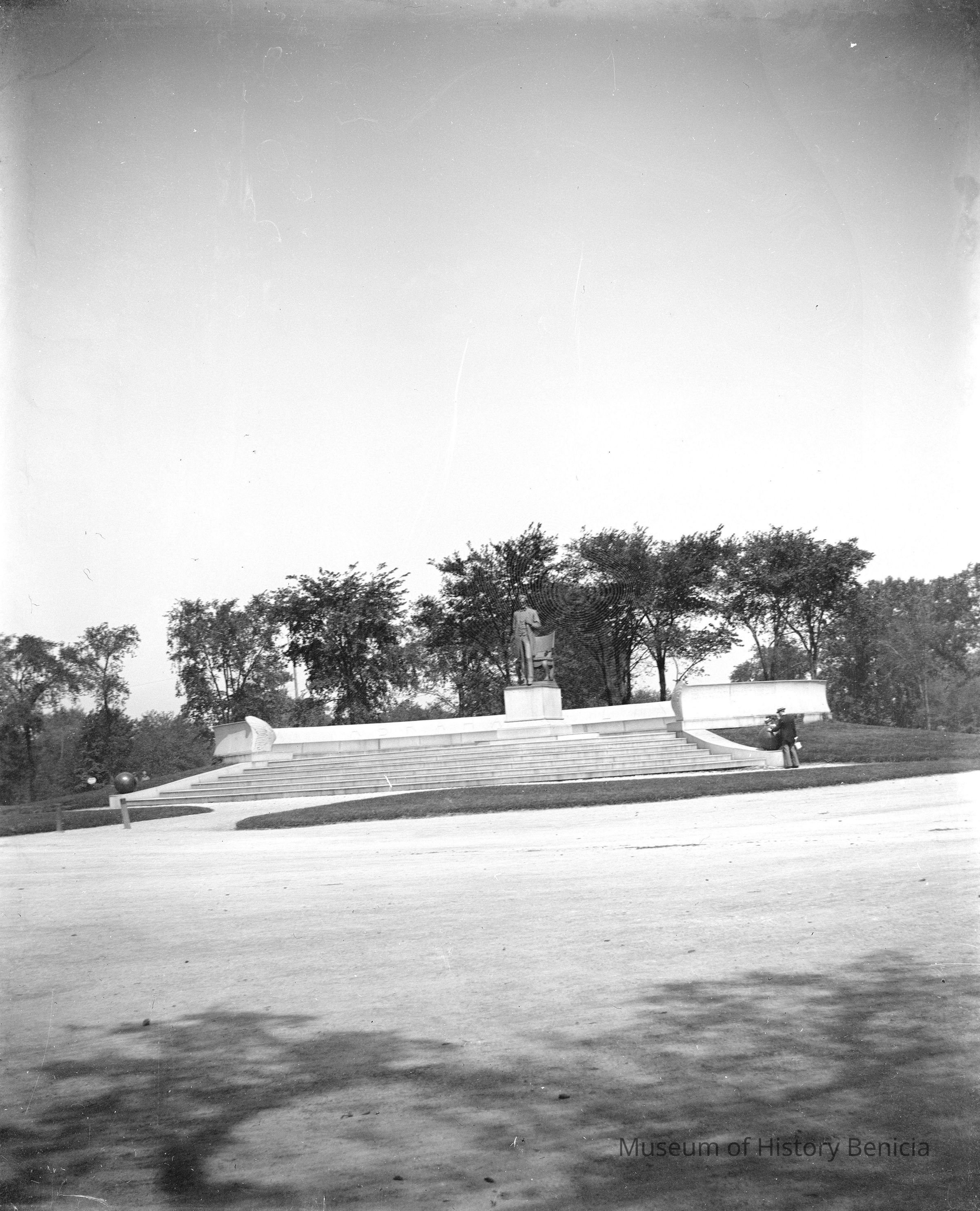 Unidentified monument; standing figure in front of chair. Black and white. "Statue of Abe Lincoln in a park. If you're near Lincoln Park in Chicago (Clark Street and North Avenue), take the opportunity to see one of America's most famous Lincoln statues. You will find it on the east lawn of the Chicago Historical Society. A replica of this work by sculptor Augustus Saint-Gaudens also stands outside Westminster Abbey, London. To create this monumental figure Saint-Gaudens used the 1860 life mask of Lincoln by Chicago sculptor Leonard Volk. A Vermont farmer of approximately Lincoln's height served as the model. Thousands of people watched the dedication ceremony on October 22, 1887, when Lincoln's grandson and namesake unveiled the statute and Leonard Swett delivered the address. "Collection