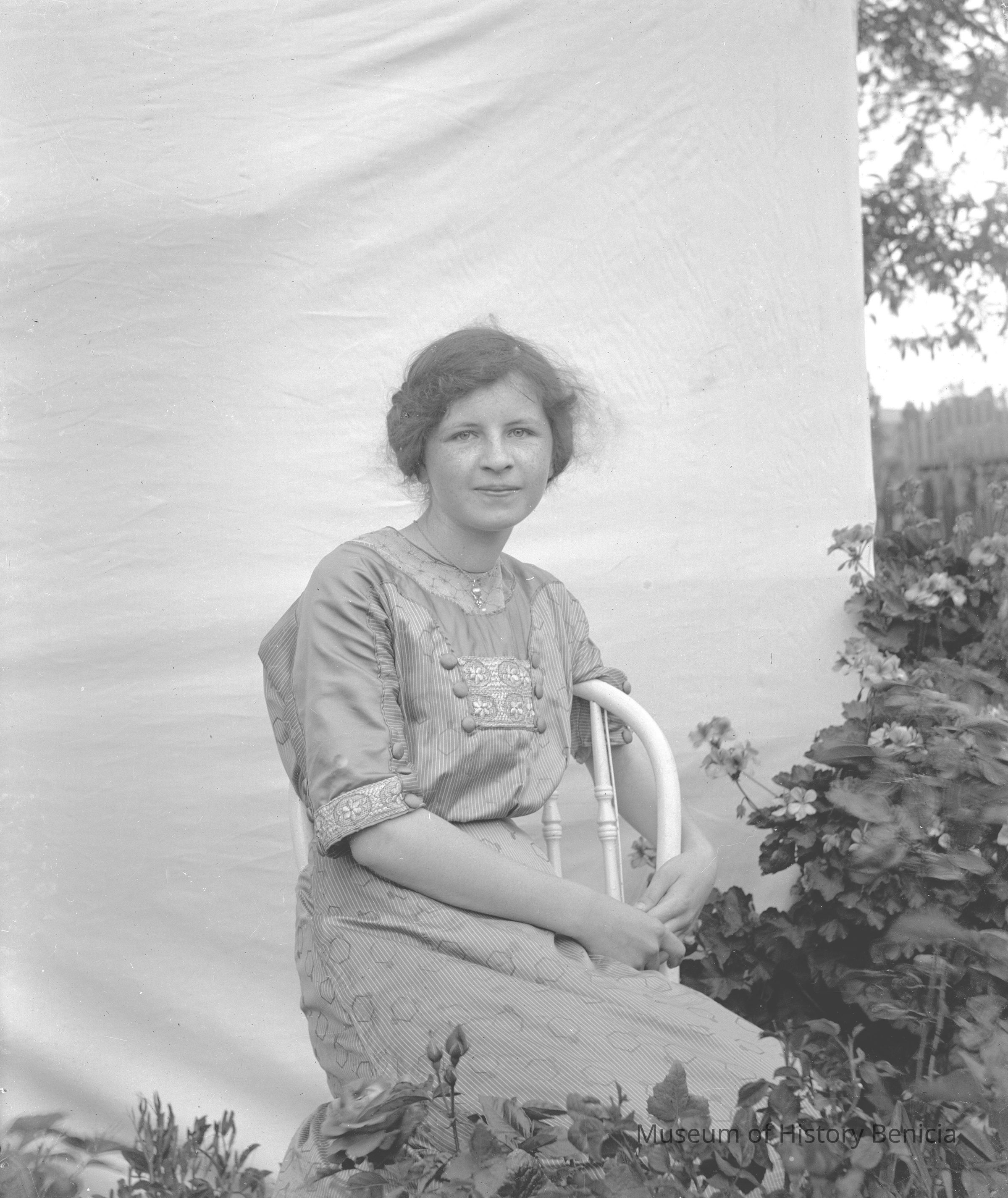 Portrait of a woman sitting in front of a back drop with flowers to her left and in front of her. She is looking directly at the viewer.Collection
