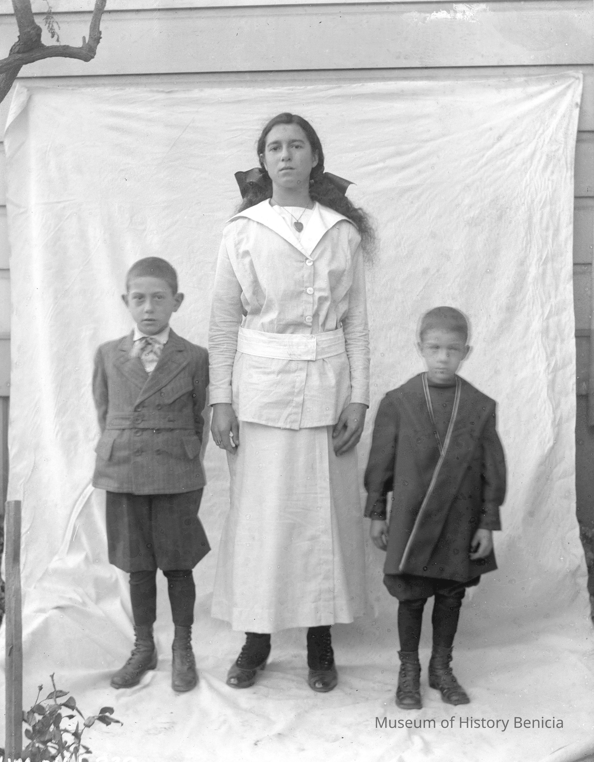 Young woman from 333 with two boys from 337 in front of sheet. A young girl with two young boys.