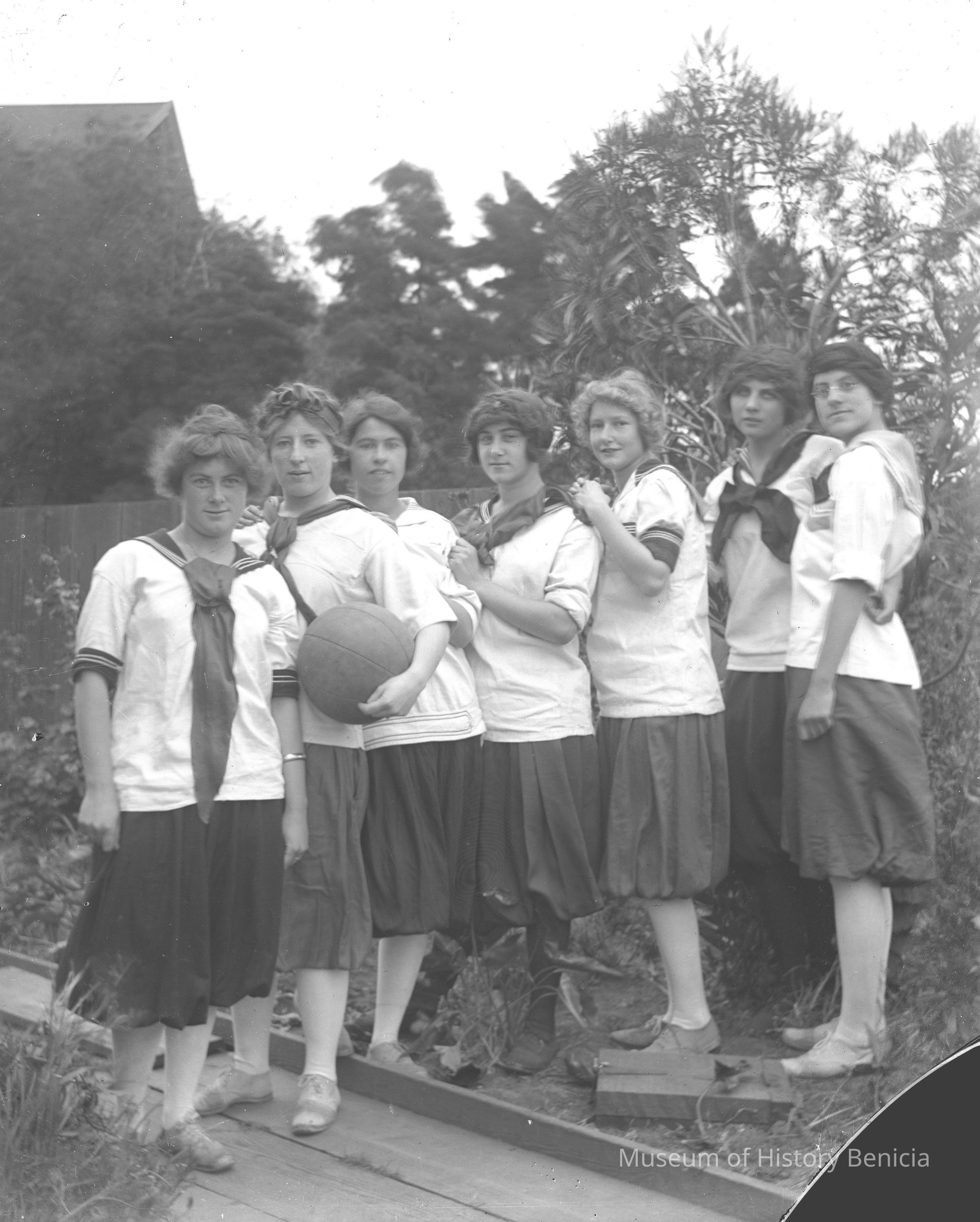 Seven young women wearing white skirts and dark shirts (these look like sailor shirts) posing outside. One girl is holding a basketball.Collection