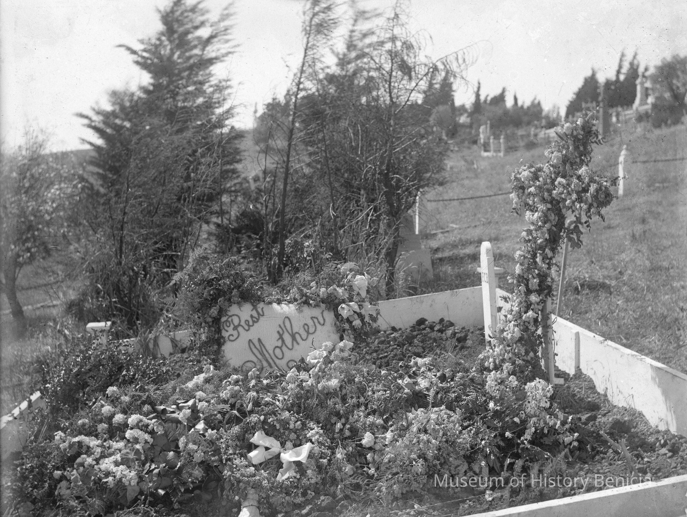 Cemetery showing fresh gravesite with sign "Rest Mother" and many flowers. Initials "ECB" visible on gravestone.