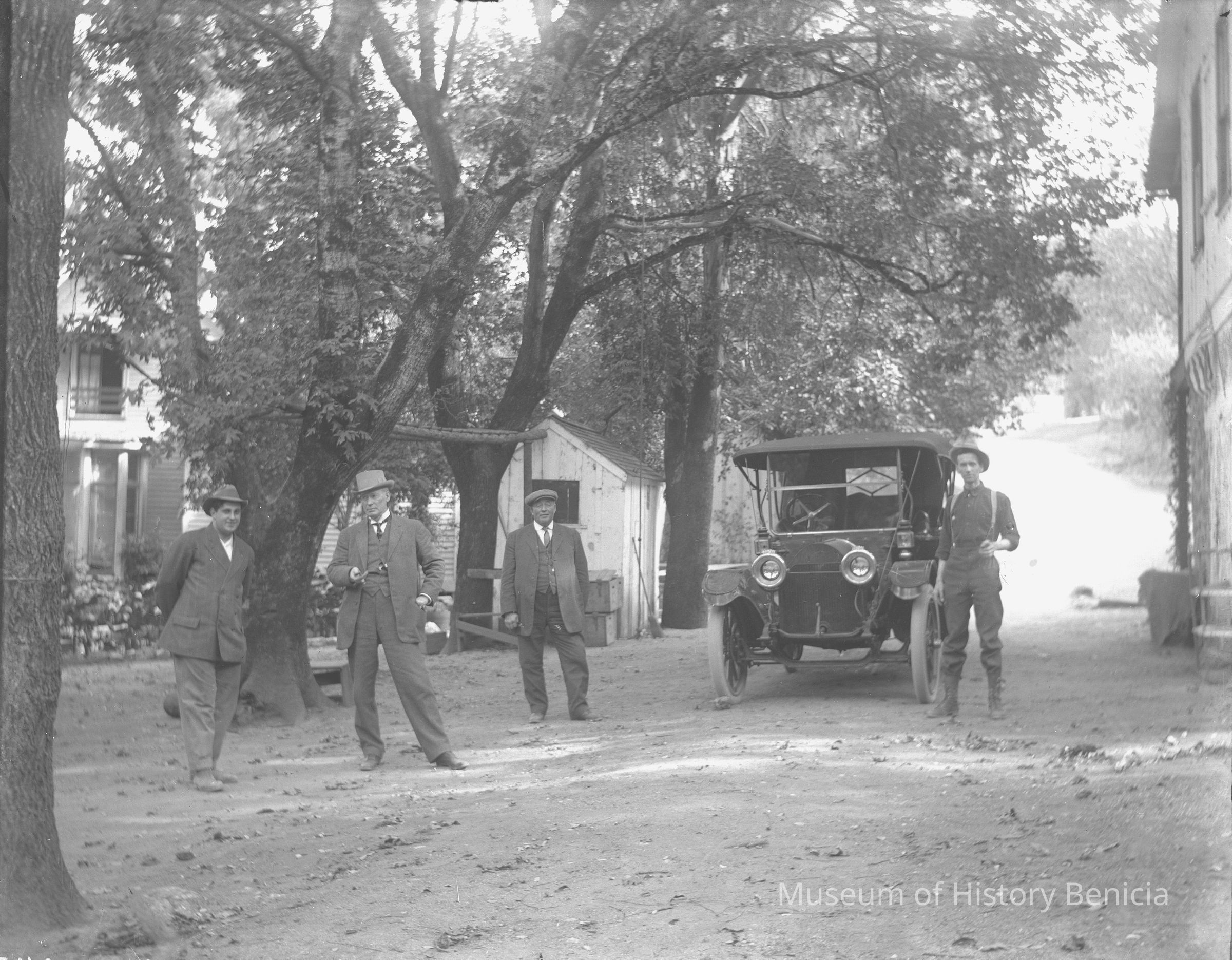 Four men standing underneath large trees. Buildings can be seen in the background (unidentified location).Collection