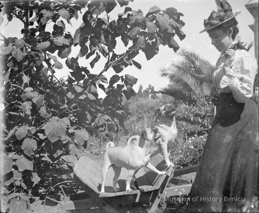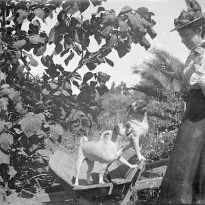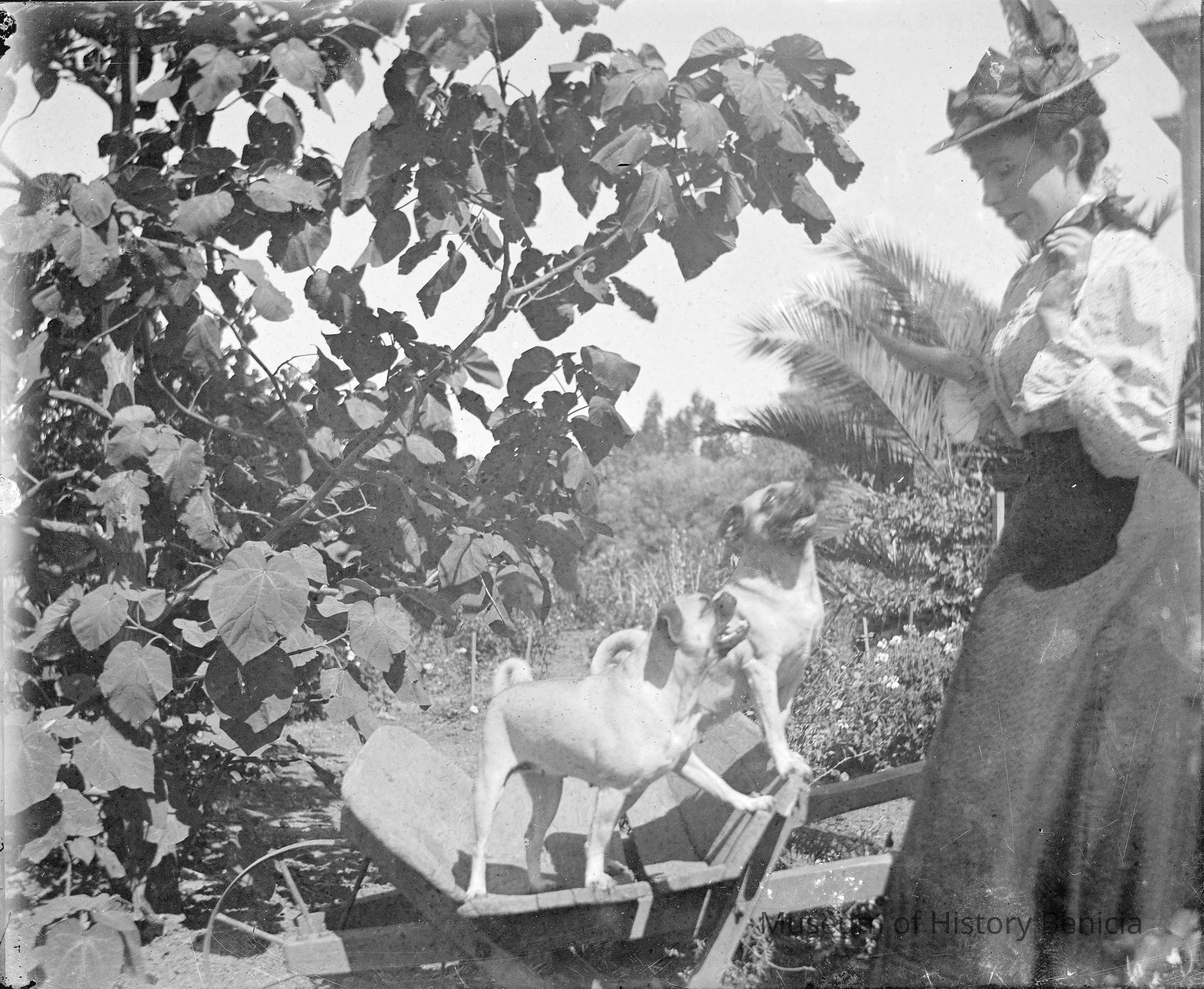 A photo of a woman and dogs (Pugs). The woman could be Henrietta Riddell-Fish.