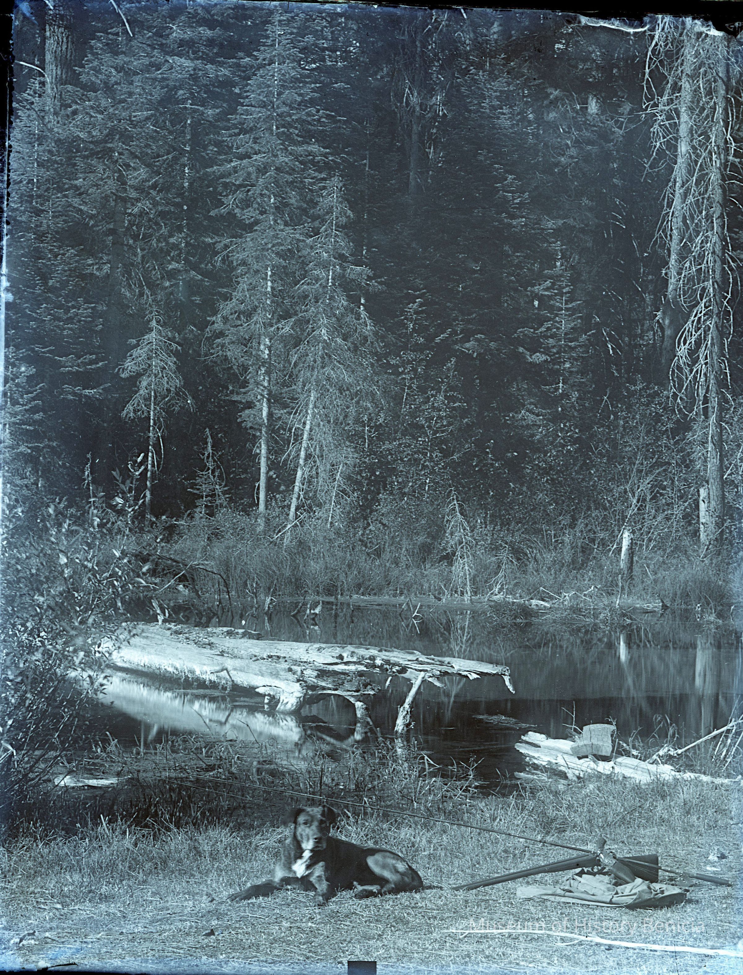 Photo of a dog and gun next to a pond.