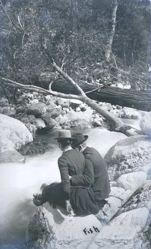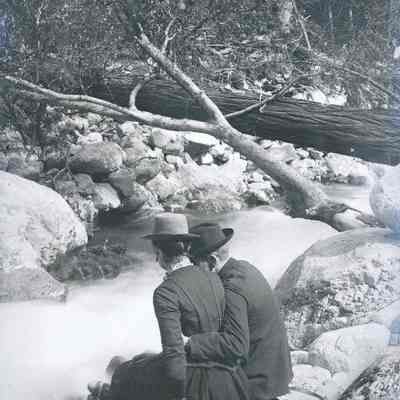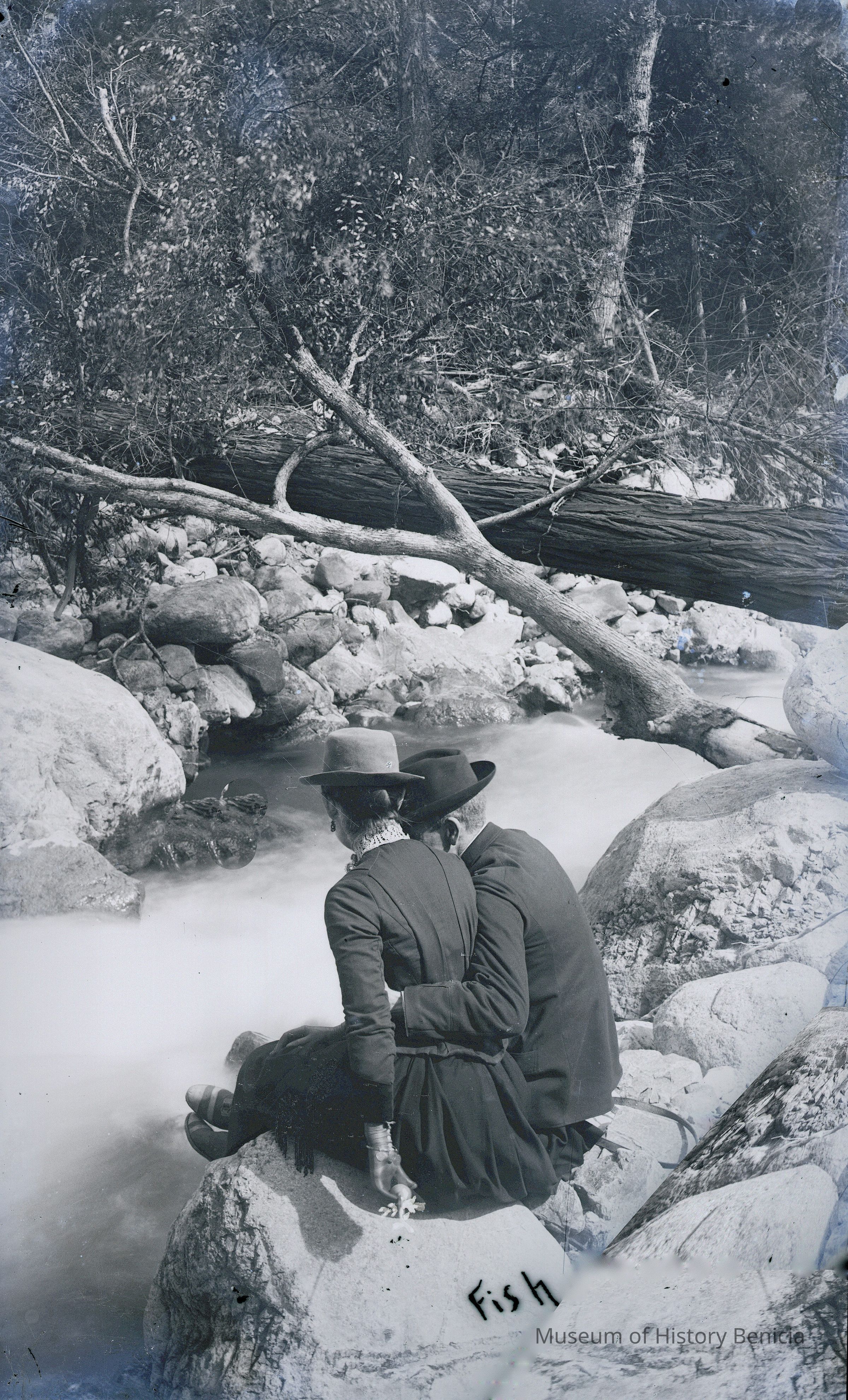 glass plate negative Shows Franklin and Henrietta Fish sitting on a rock by a rushing stream. Franklin has his arm around Henrietta's waist.Collection