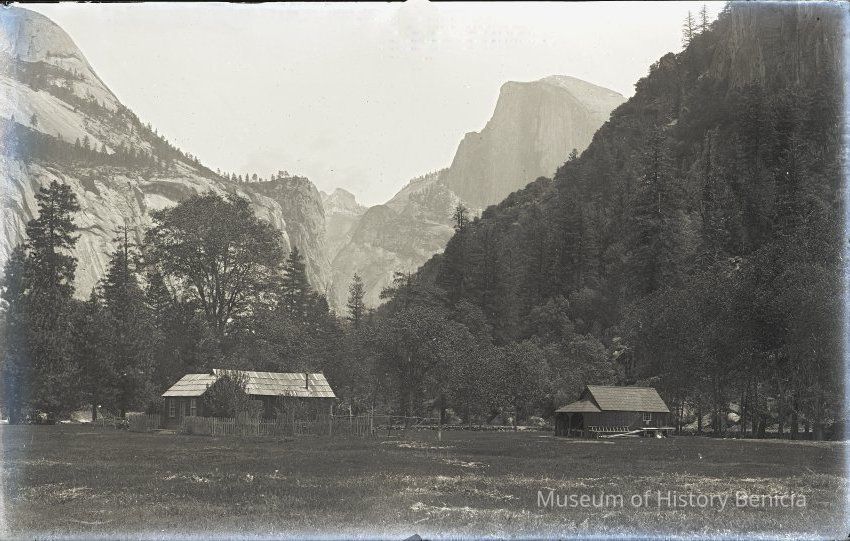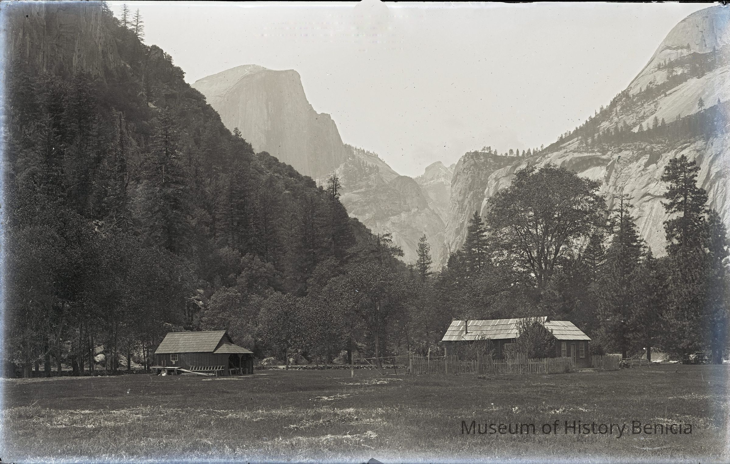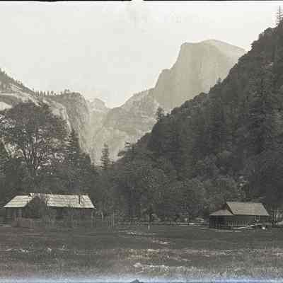 glass plate negative Shows ameadow and a ranch house below "half dome" in Yosemite.
