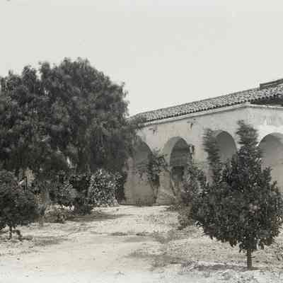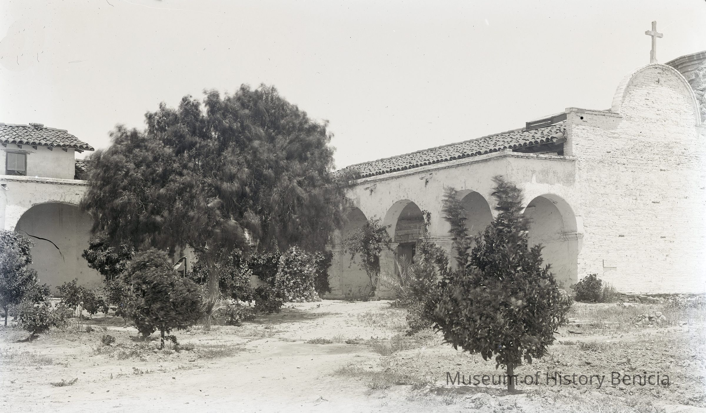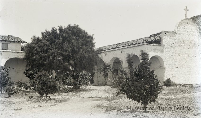 glass plate negative Shows an old adobe mission. May be the back of Mission Dolores in San Francisco. (See other negatives.)