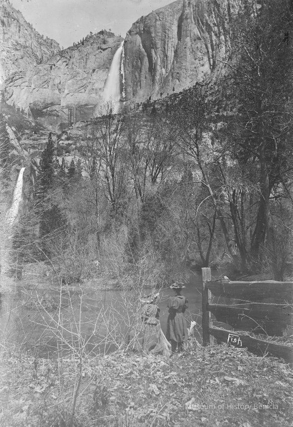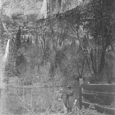 Description from Nat'l Park Service ranger at Yosemite: Yosemite Falls from Cook's Meadow area. If that's the Merced River in front of the women, this is probably just downstream of present-day Sentinel Bridge (just downstream of historic Sentinel Hotel). If not, this could be in the meadow.Collection