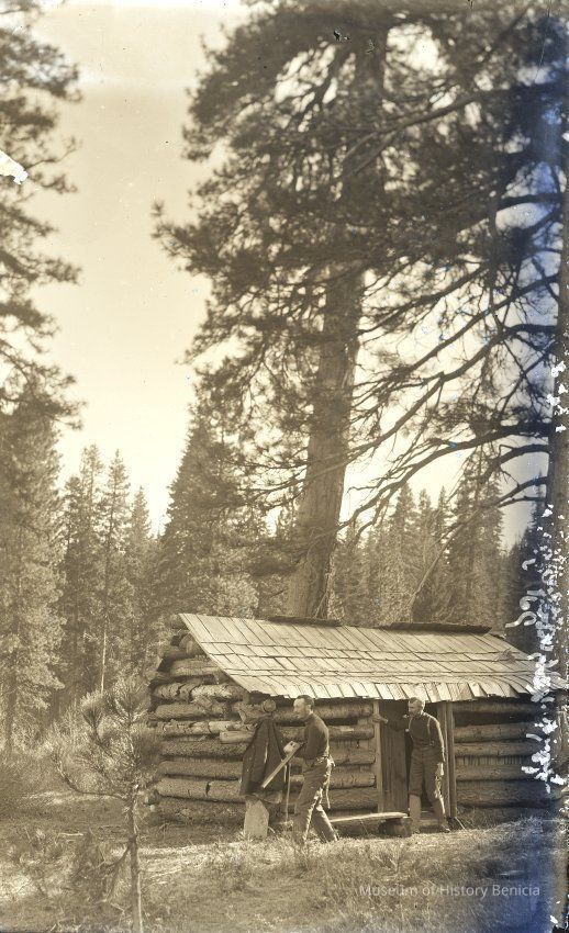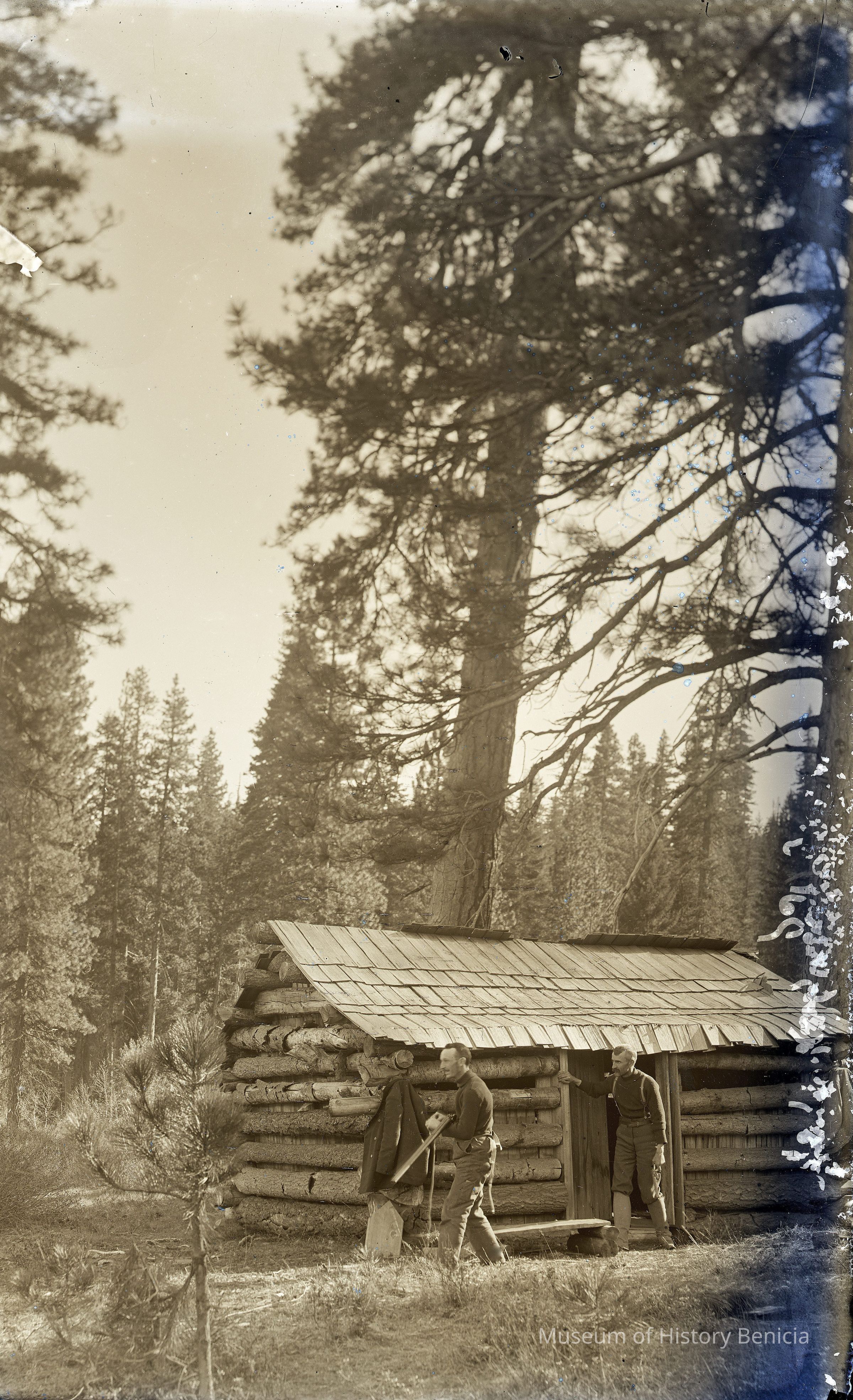glass plate negative Shows a log cabin in the woods and two men in front. One is probably Franklin Fish and the other is probably Lawrence Fish.Collection