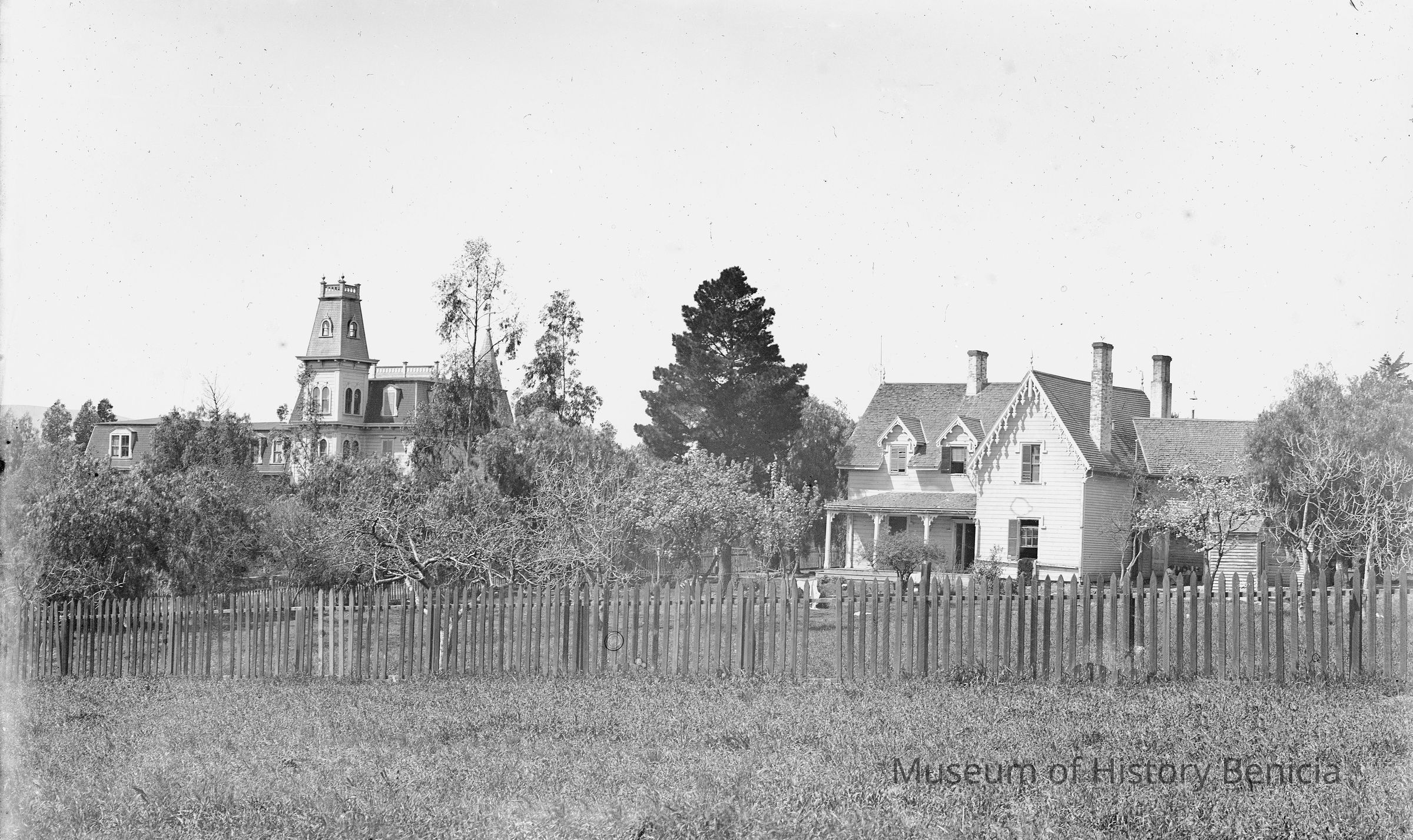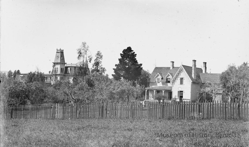 glass plate negative Shows two houses and an orchard. The house on the right looks like the Frisbee-Walsh house at 235 East L street in Benicia. If it is then the structure on the left is St. Mary's of the Pacific at East Second and L street (where city hall now sits).Collection