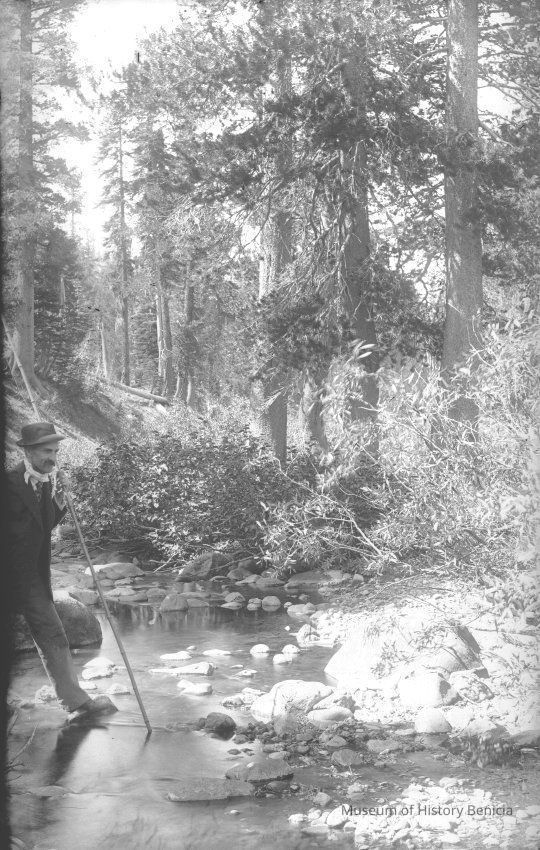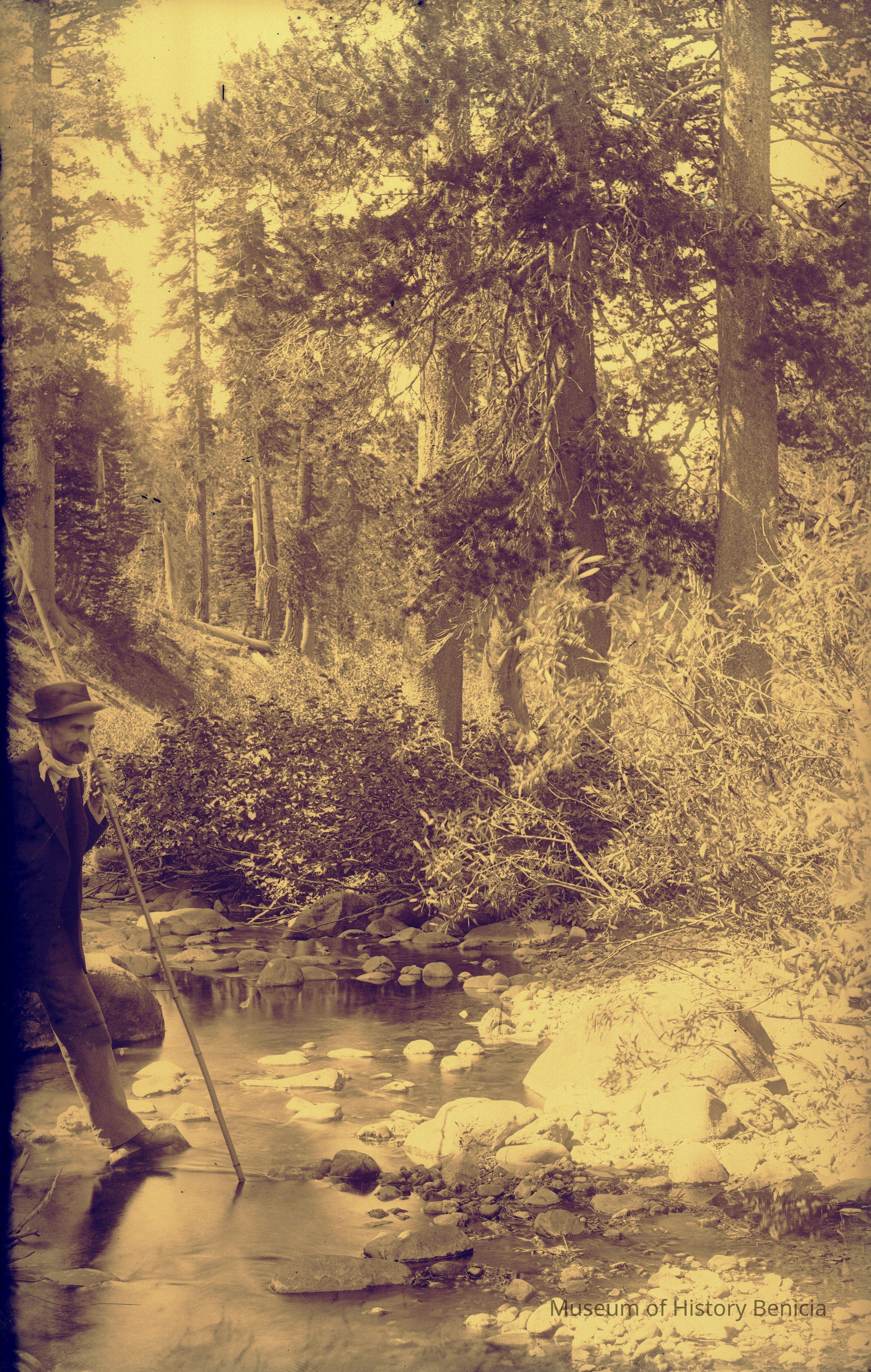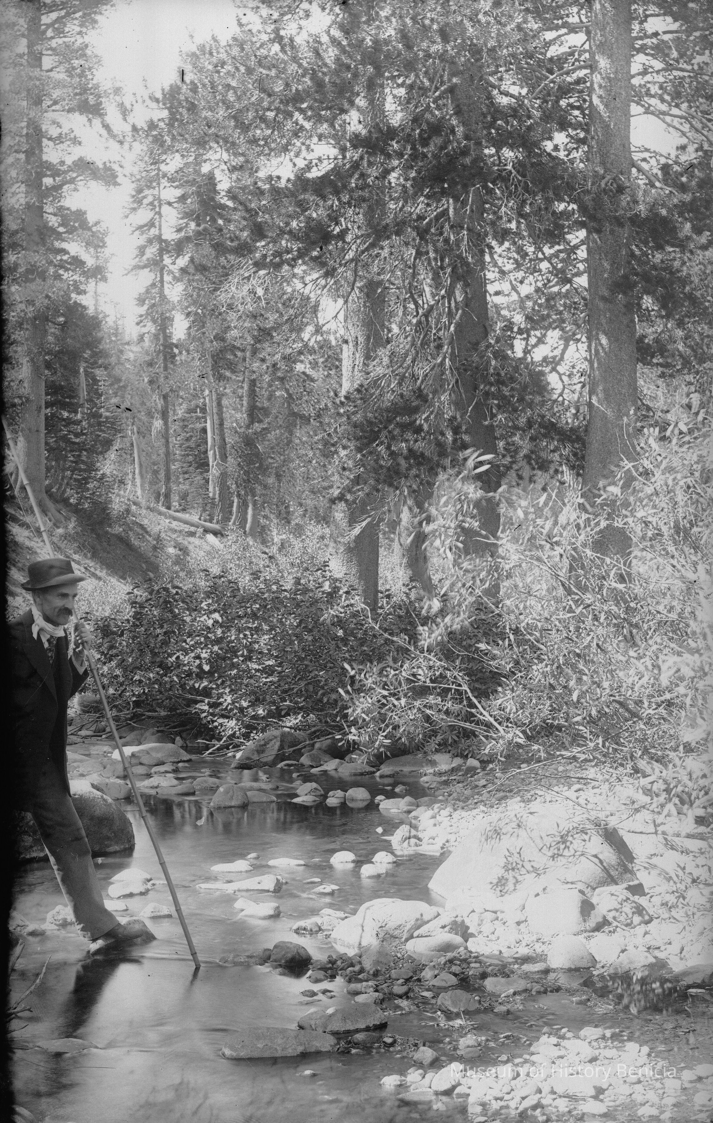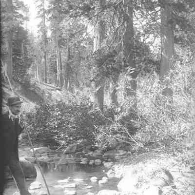 glass plate negative Shows Franklin Fish crossing a stream with a large walking stick.