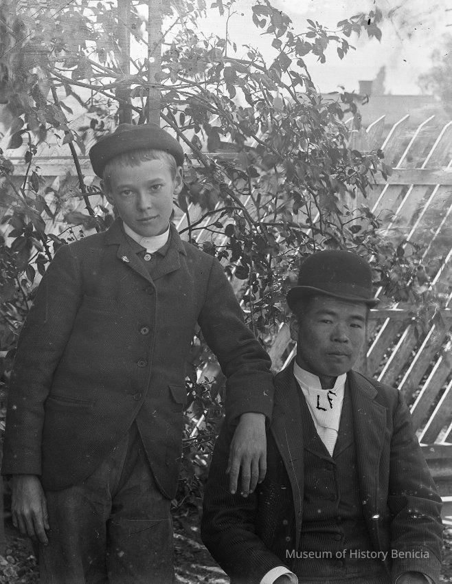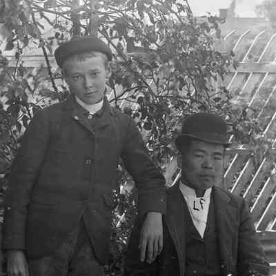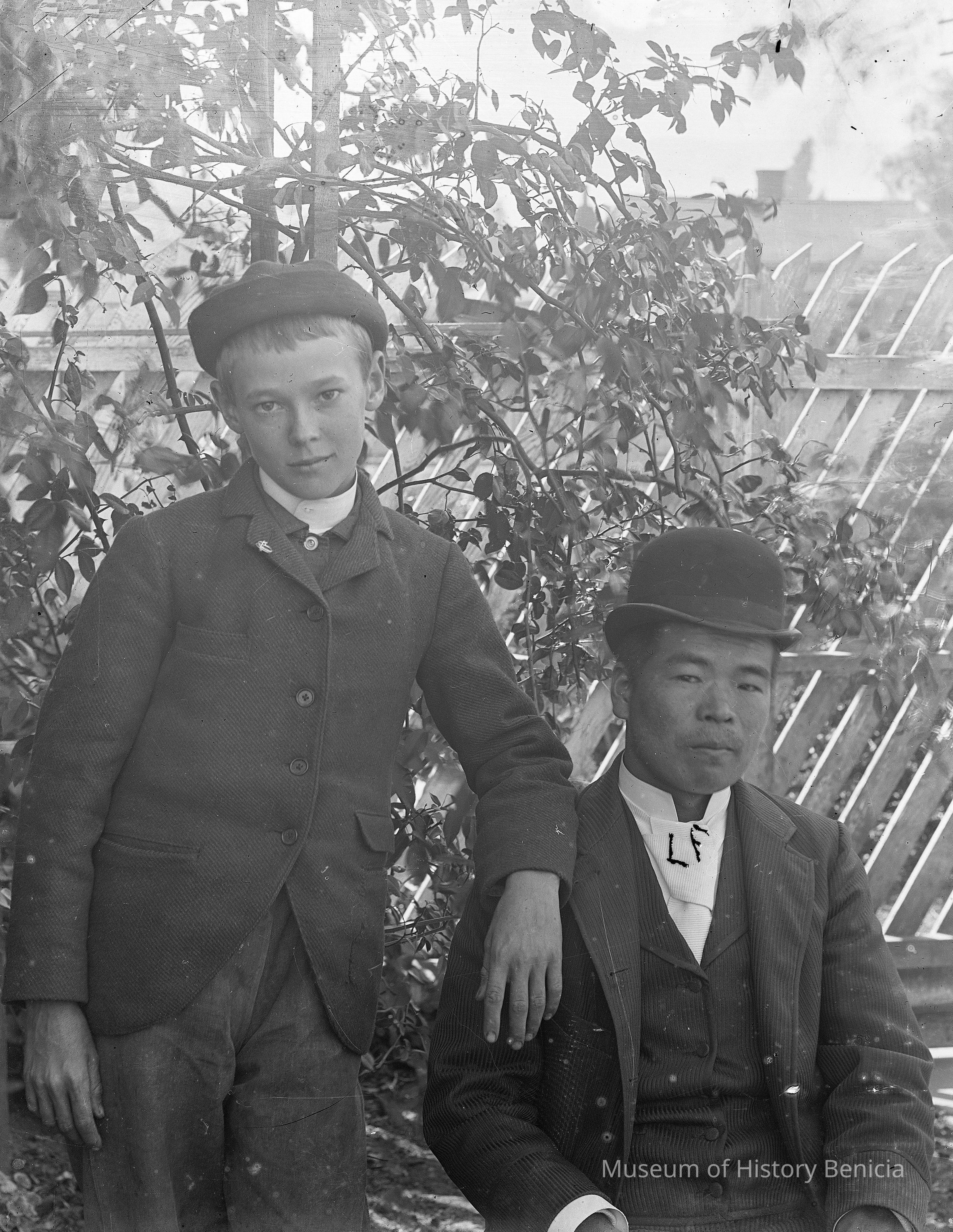 glass plate negative Portrait of a young boy (probably Lawrence Fish) with a Chinese gentleman.