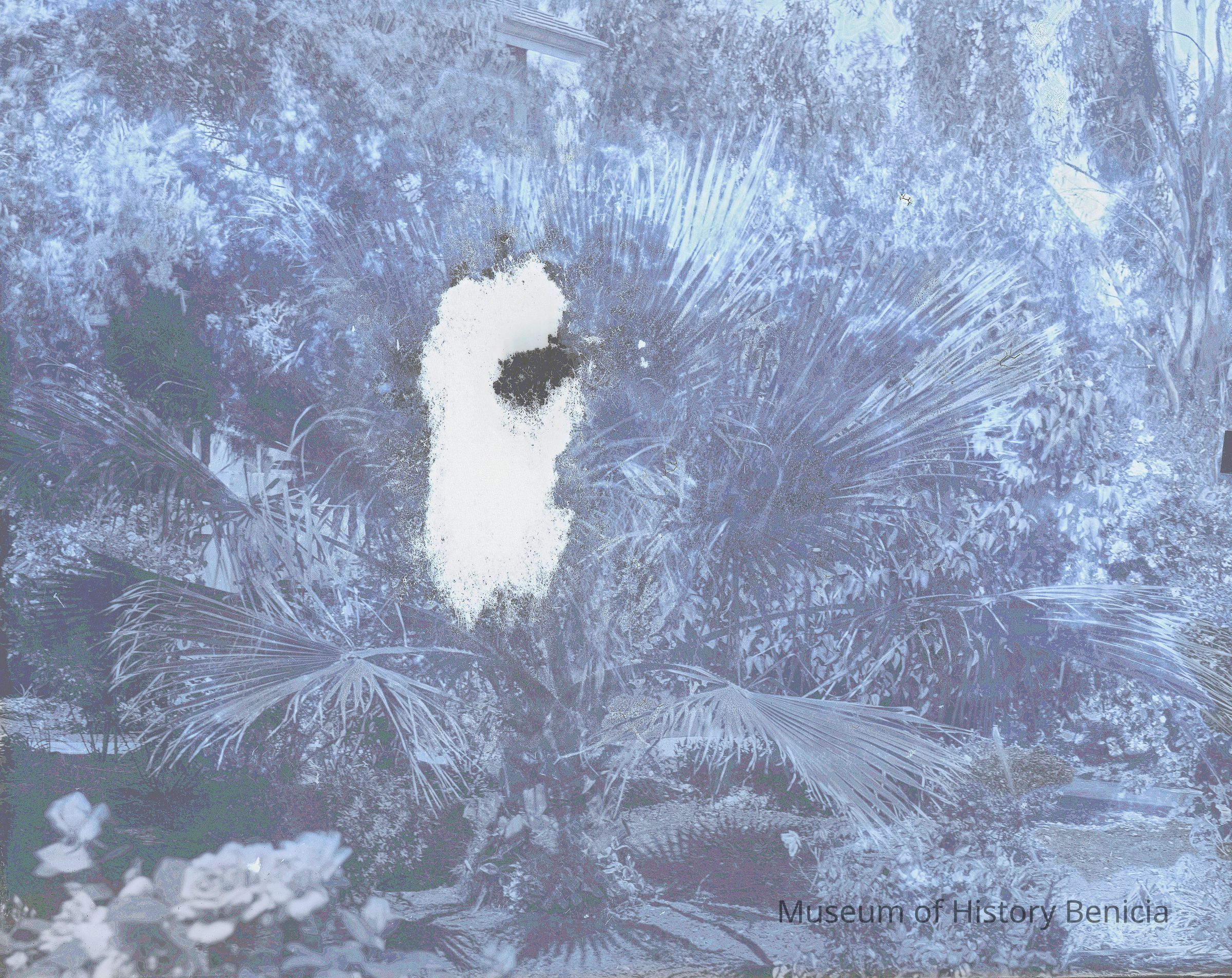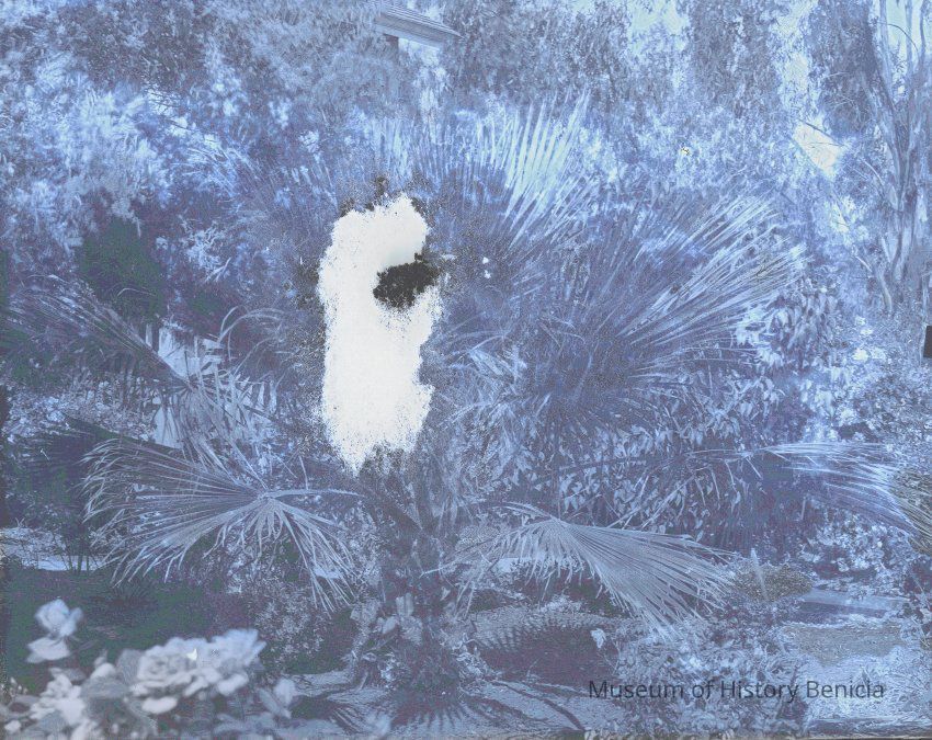glass plate negative Close up of a palm tree next to a house. Probably one of the palm trees next to the Riddell-Fish house at 265 West K st.Collection