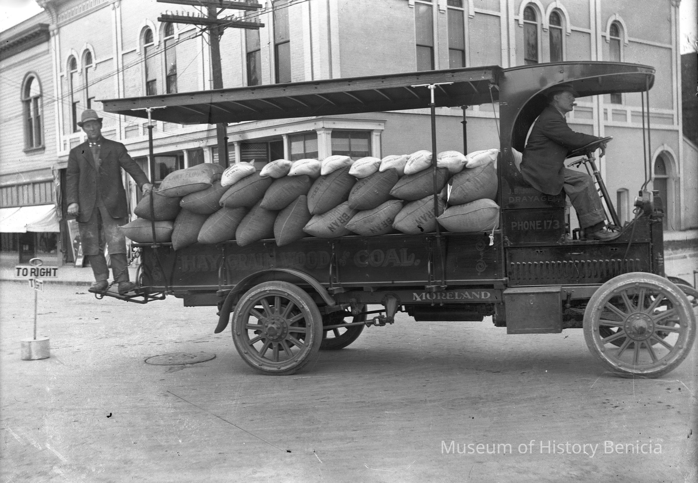 Man driving a truck Moreland without a tarp. The company name is J.B. Johnson phone number 173. The truck says "hay grain, wood coal" on side. The bags in the truck are bran and flour. Truck is on First and West J Streets.Collection