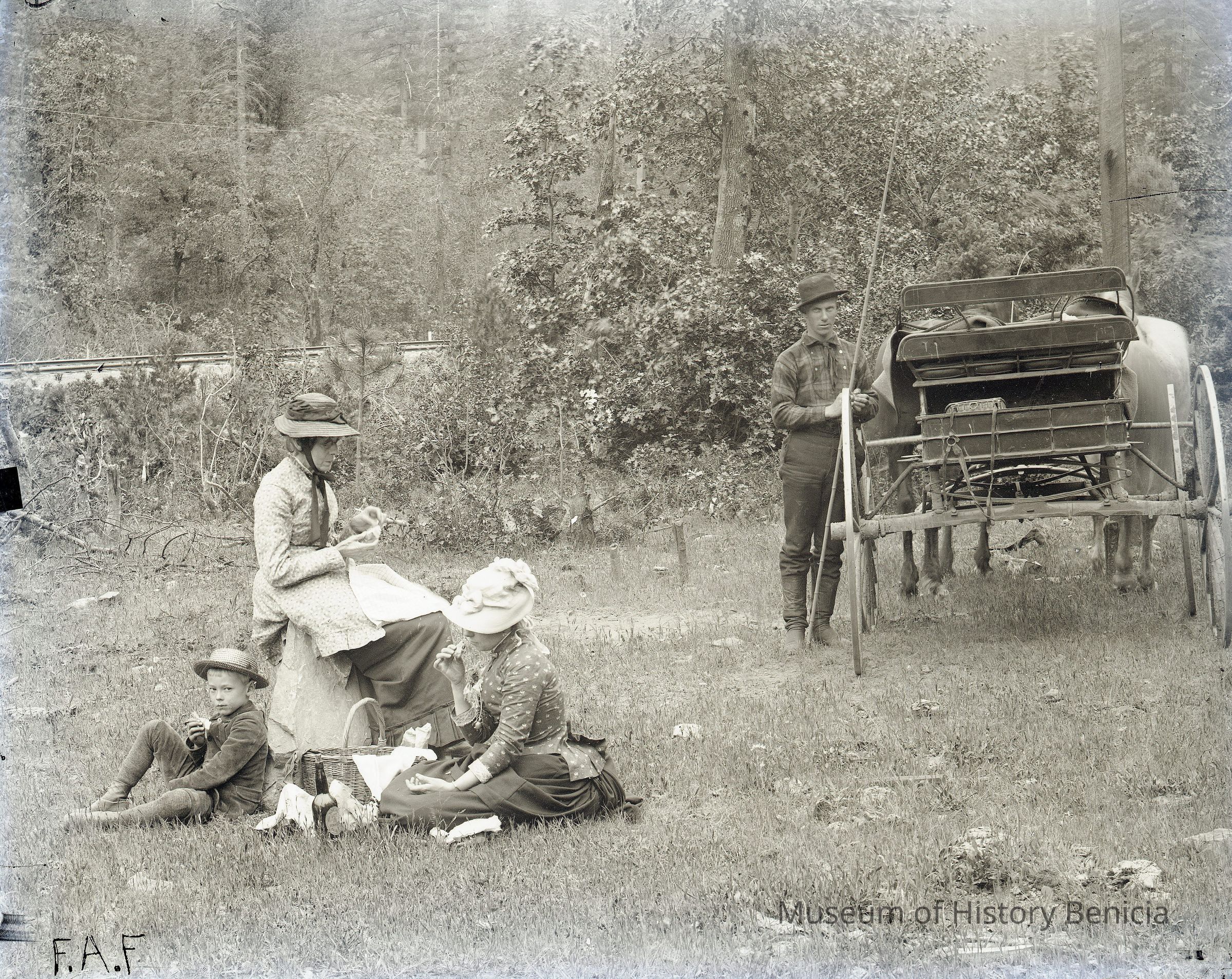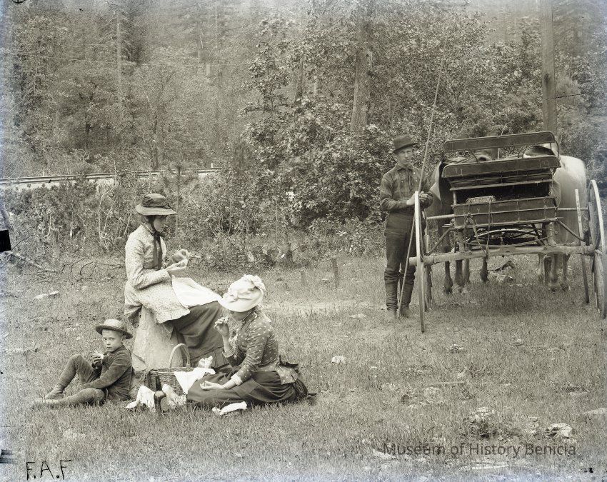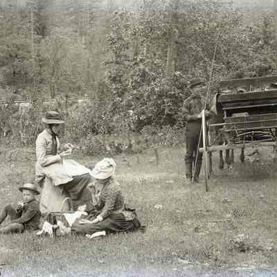 glass plate negative from plate box identified as either Gap Carson or Carmel Cal. Photo of a family having a picnic lunch by a carriage in the woods. One of the women looks like Henrietta Riddell-Fish.Collection