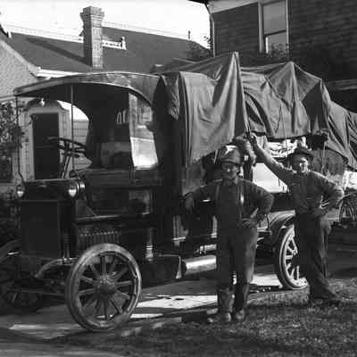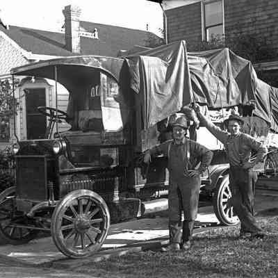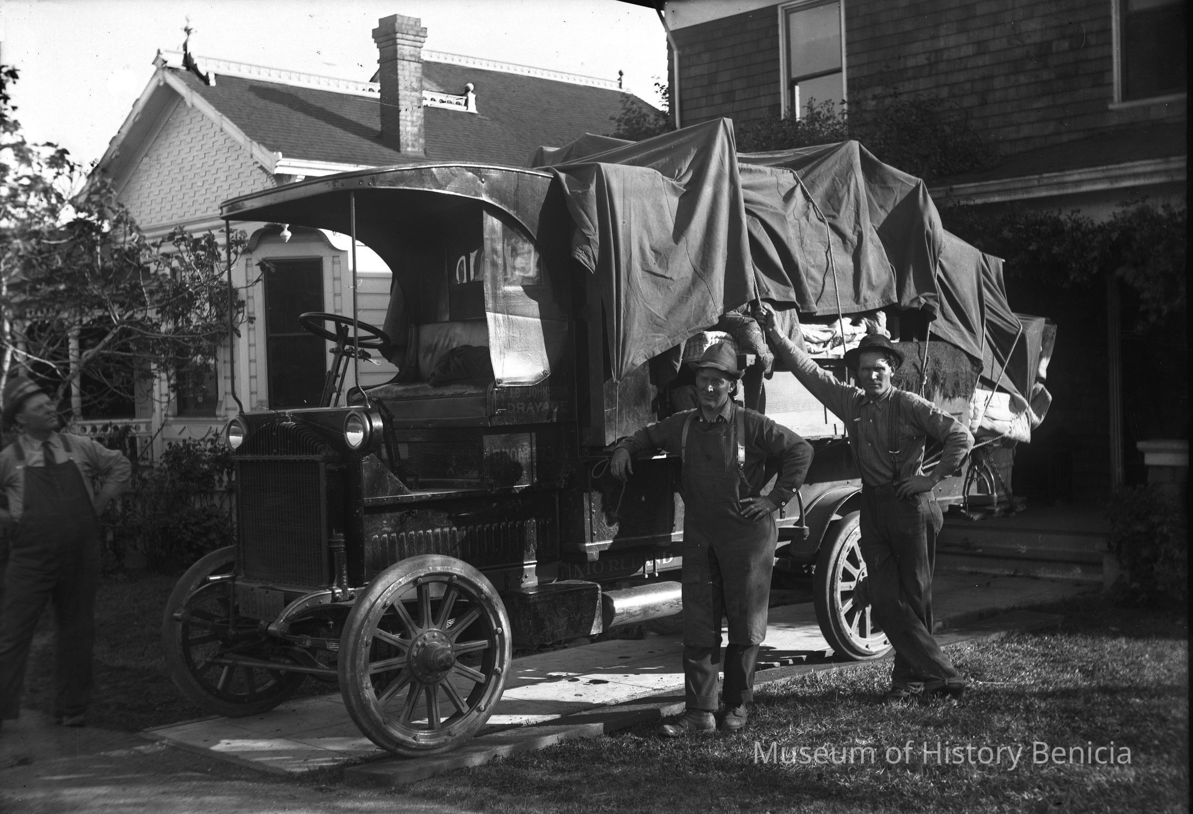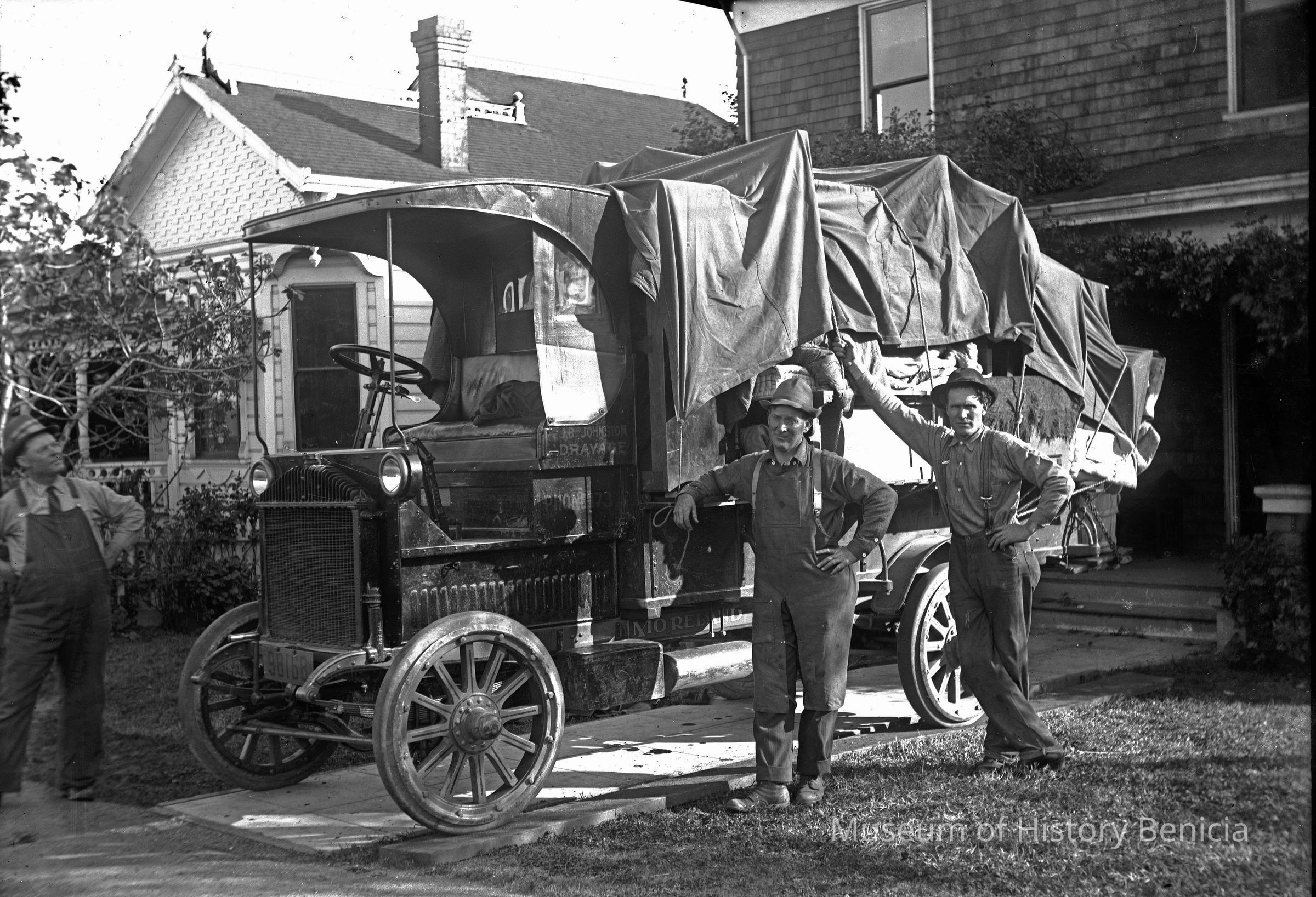 Three men standing beside a Truck Moreland with tarp cover on. The company name is J.B. Johnson Drayage. The truck is in front of a home and seems to be loaded with furniture. (There is a mattress visable under the tarp.)