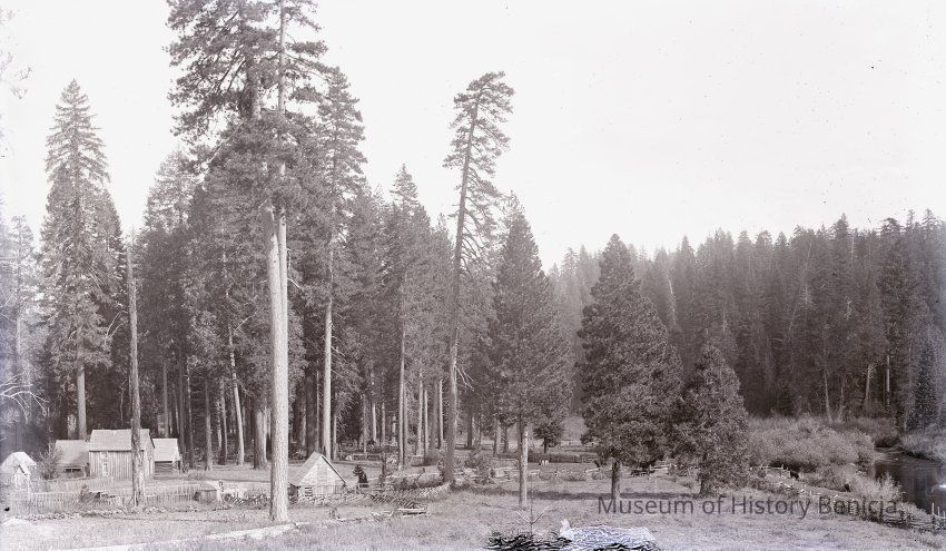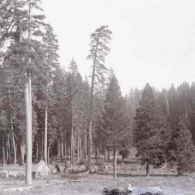 glass plate negative from plate box identified as "box 2" Shows a camp in the woods. There are several cabins and areas fenced off.Collection