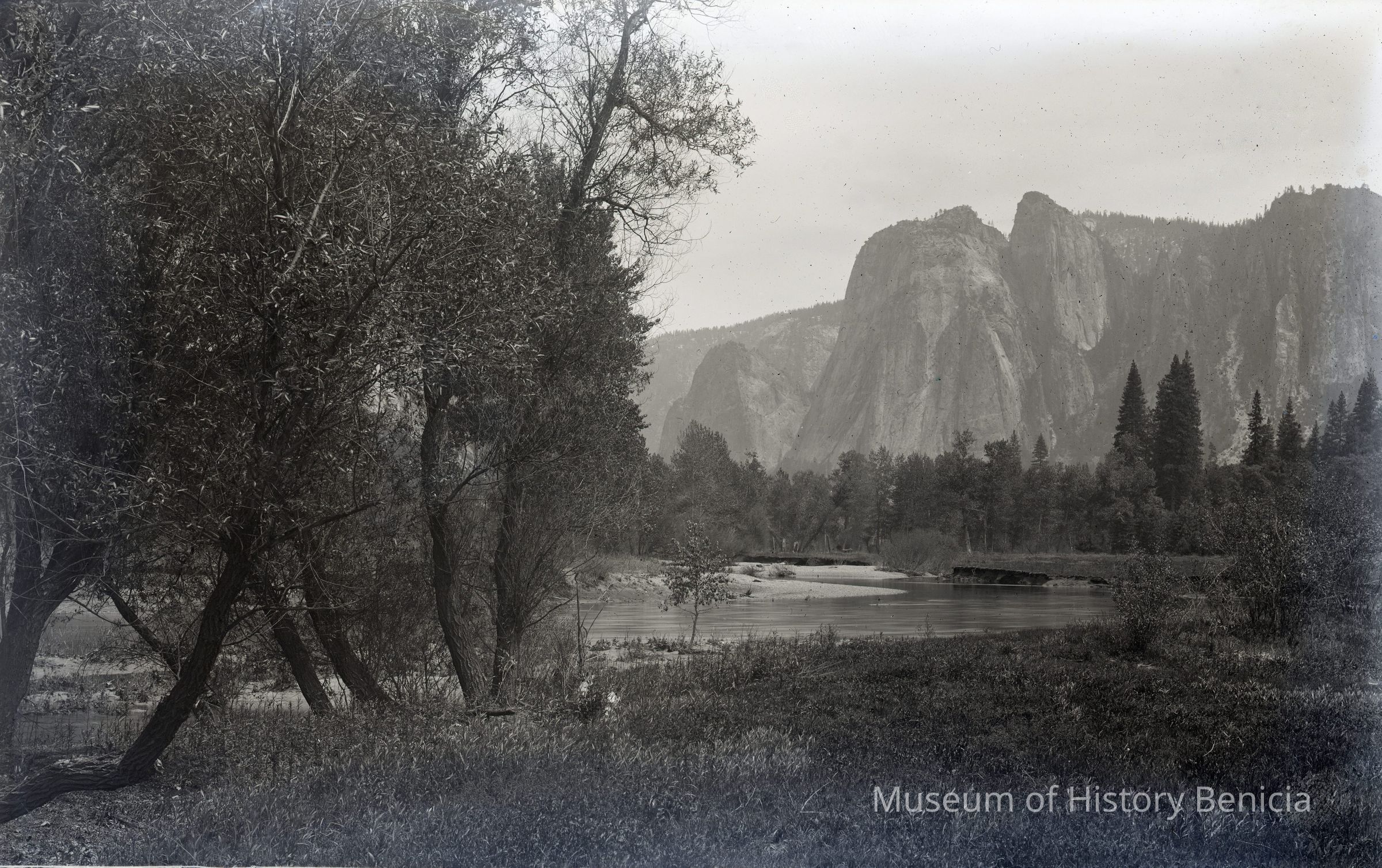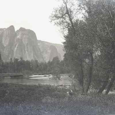 glass plate negative from plate box identified as "box 11". View in Yosemite of the Merced river and rocky spires behind.