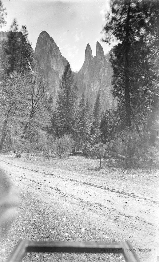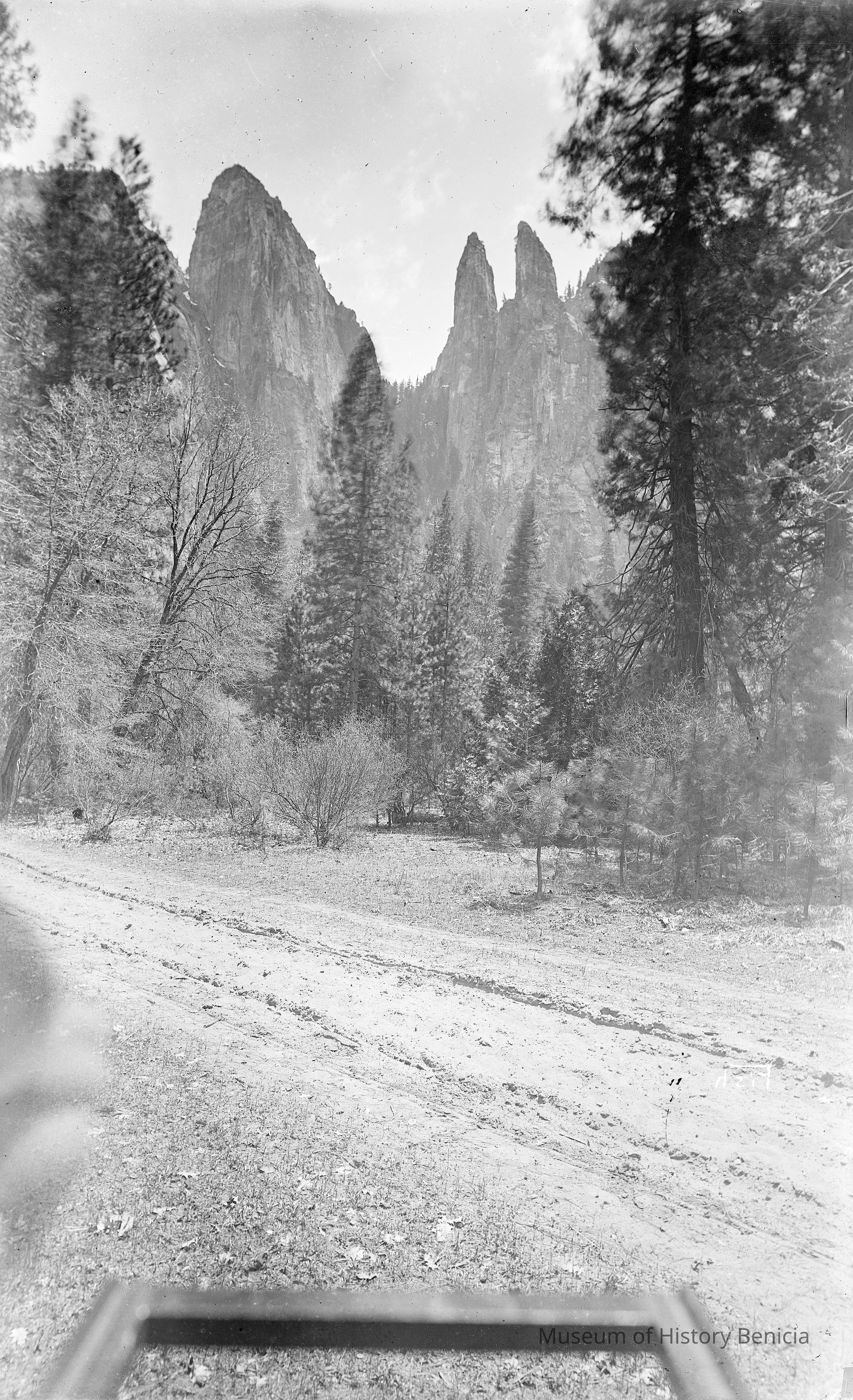 glass plate negative from plate box identified as "box 17". View of Catedral Spires in Yosemite. The photographer has managed to include part of his cameras lensboard and his hand in the photo.