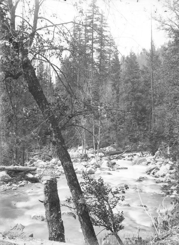 glass plate negative from plate box identified as "box 7" Shows a mountain stream and trees. There is writting on the edge of the plate but it hard to read. Part of it looks like a date "07/10".Collection