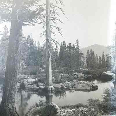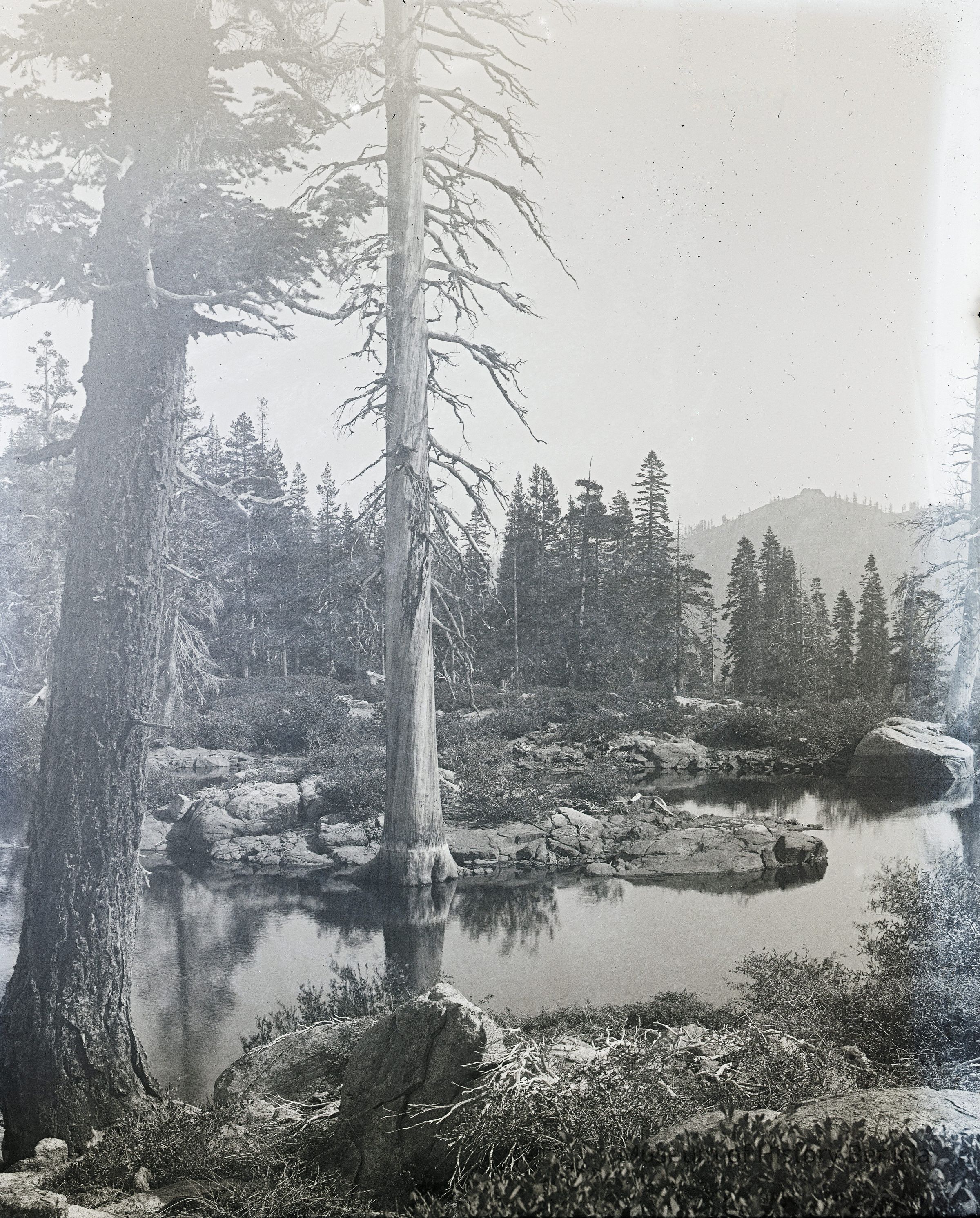 glass plate negative from plate box identified as "box 7" Shows a mountain lake or stream with trees.