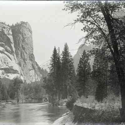 glass plate negative. Shows a lake and rocky peak in the distance. Looks like Yosemite.