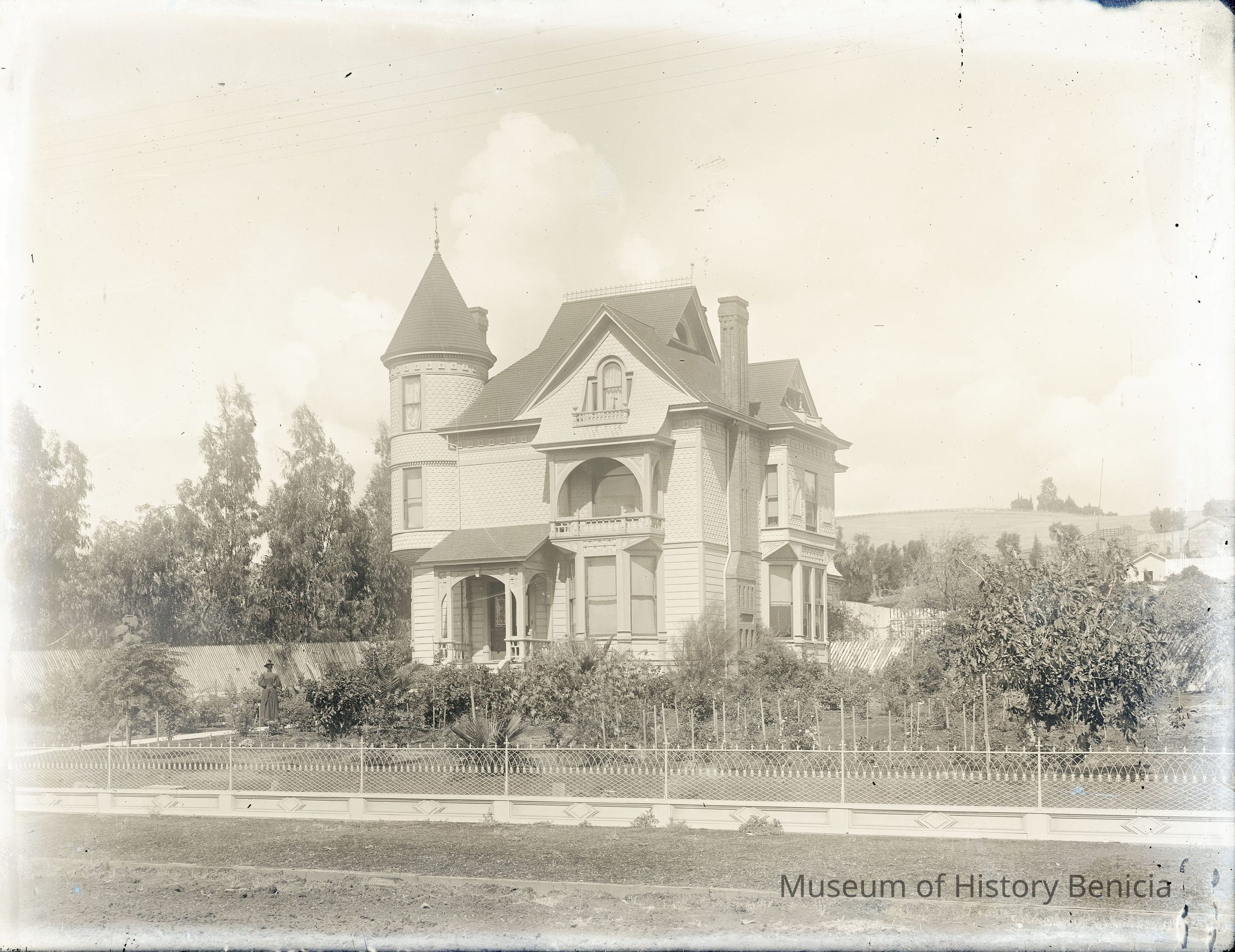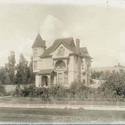 glass plate negative. Shows the Riddell-Fish house not too long after it was built. The windows on the second story have not been added, the street is not paved and there is no sidewalk. Note that in the background on the right, there is a fenced in area and a barn This looks similar to the area where the horse and mule photos were shot.Collection