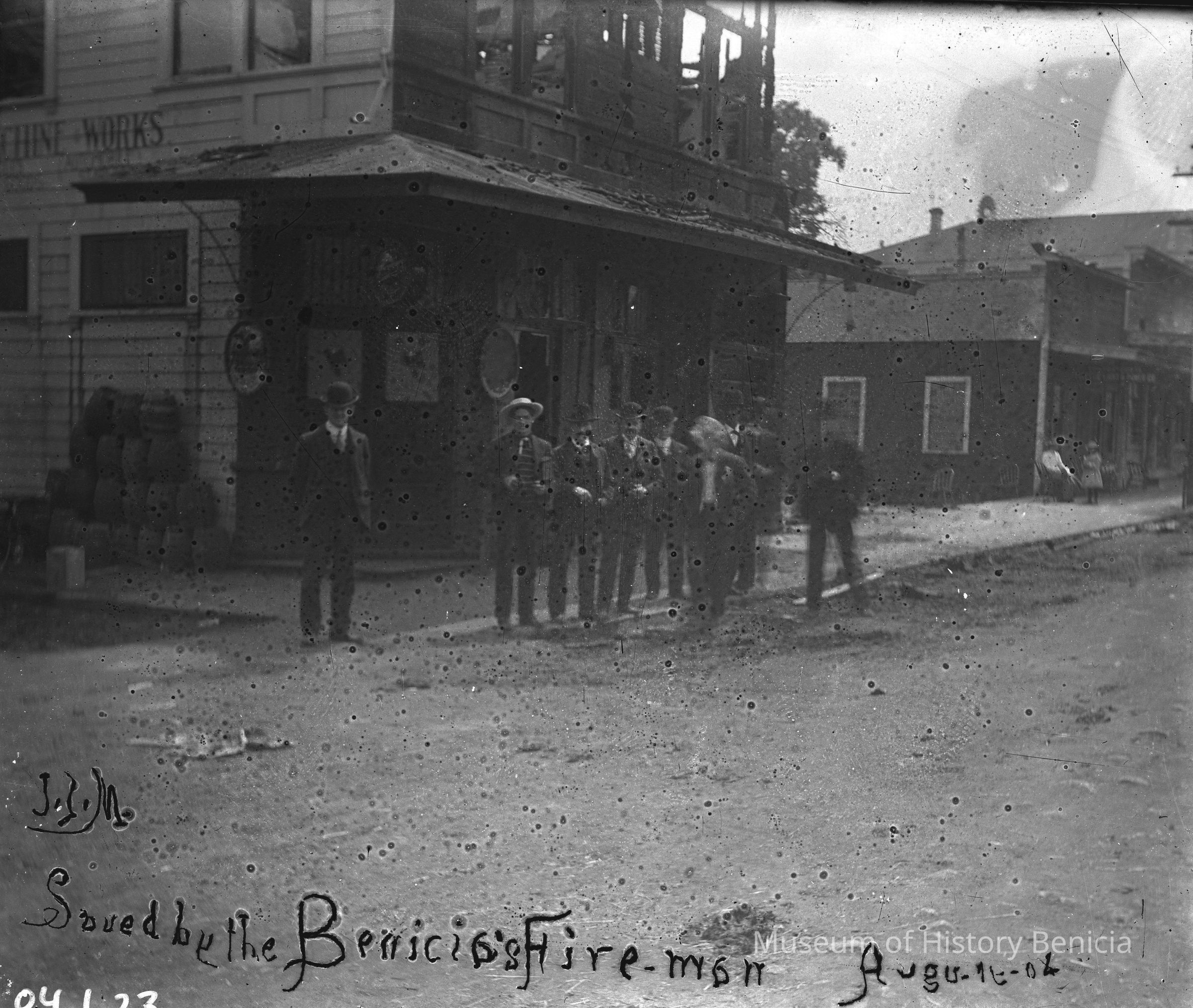 A group of men standing in front of an unrecognized building. Inscription on the photo says "saved by the Benicia's firemen Aug 19 '04. There are several men standing in front of the burned out structure.