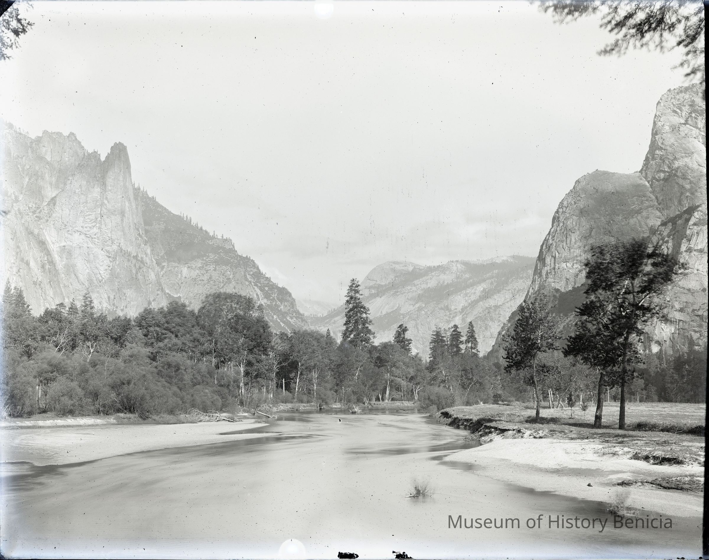 glass plate negative. Shows a stream and rocky peak in the distance. Looks like Yosemite.