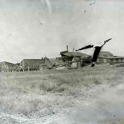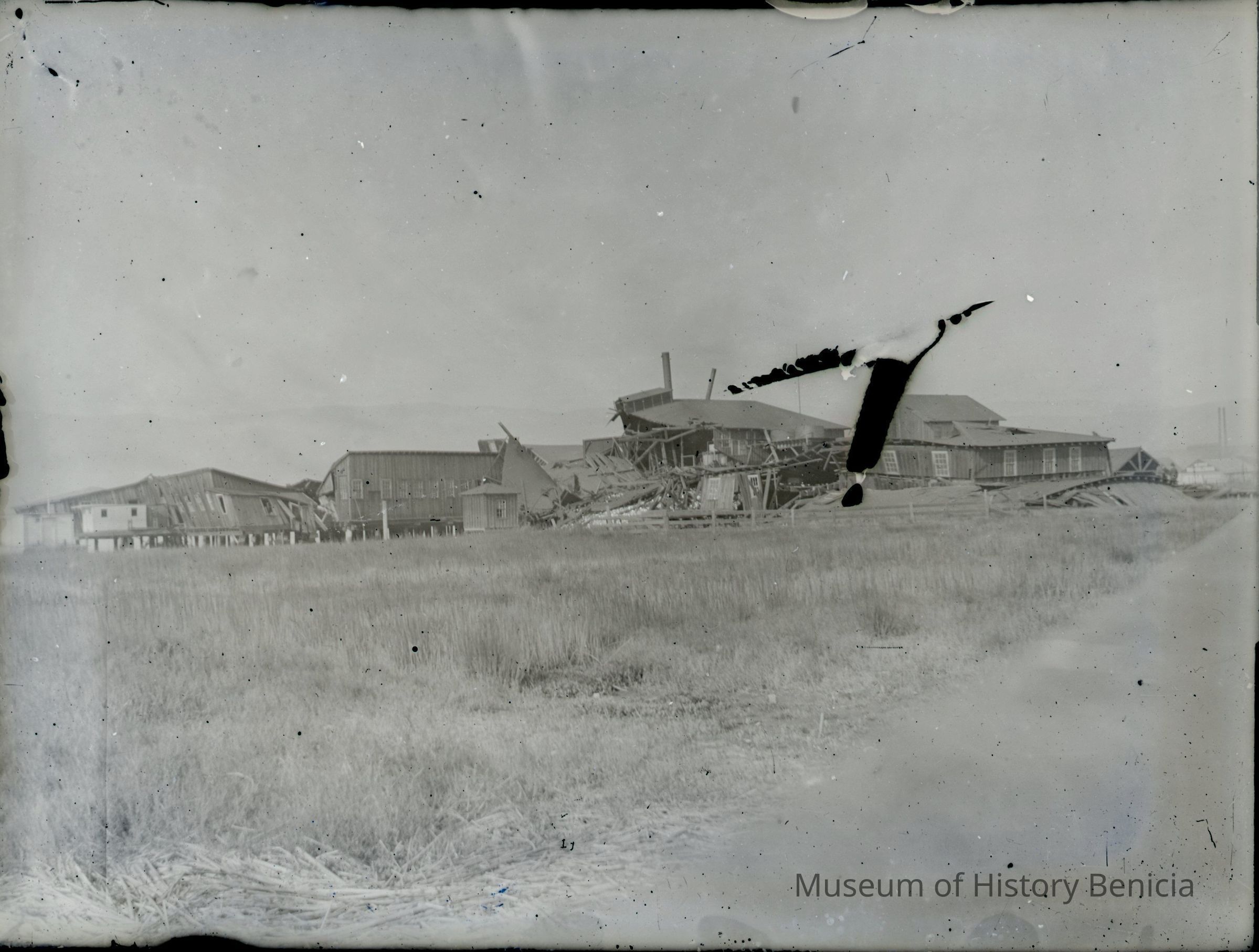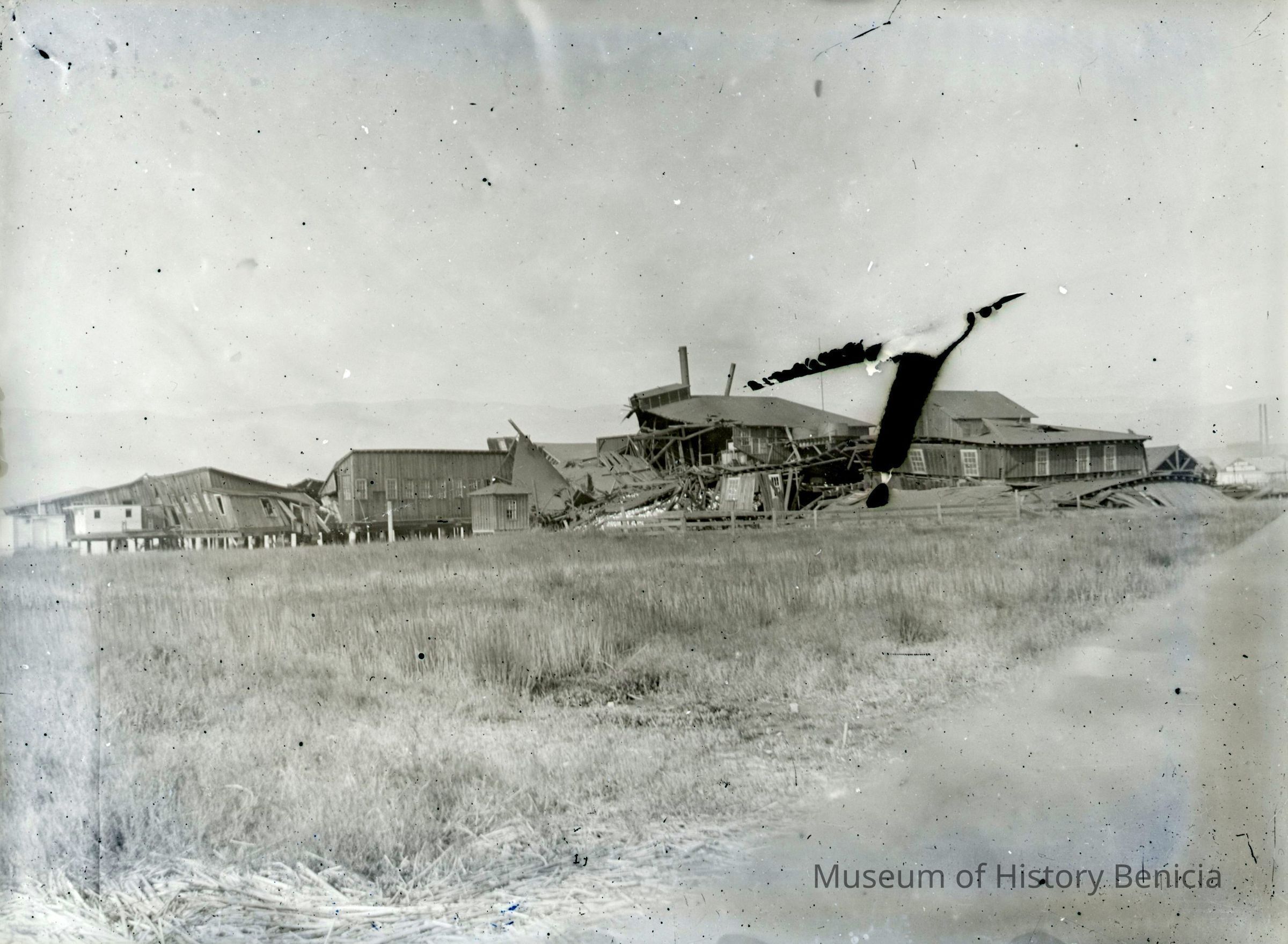 Glass plate negative showing a wrecked building on the wharf. Possibly a building damaged in the 1906 SF earthquake.