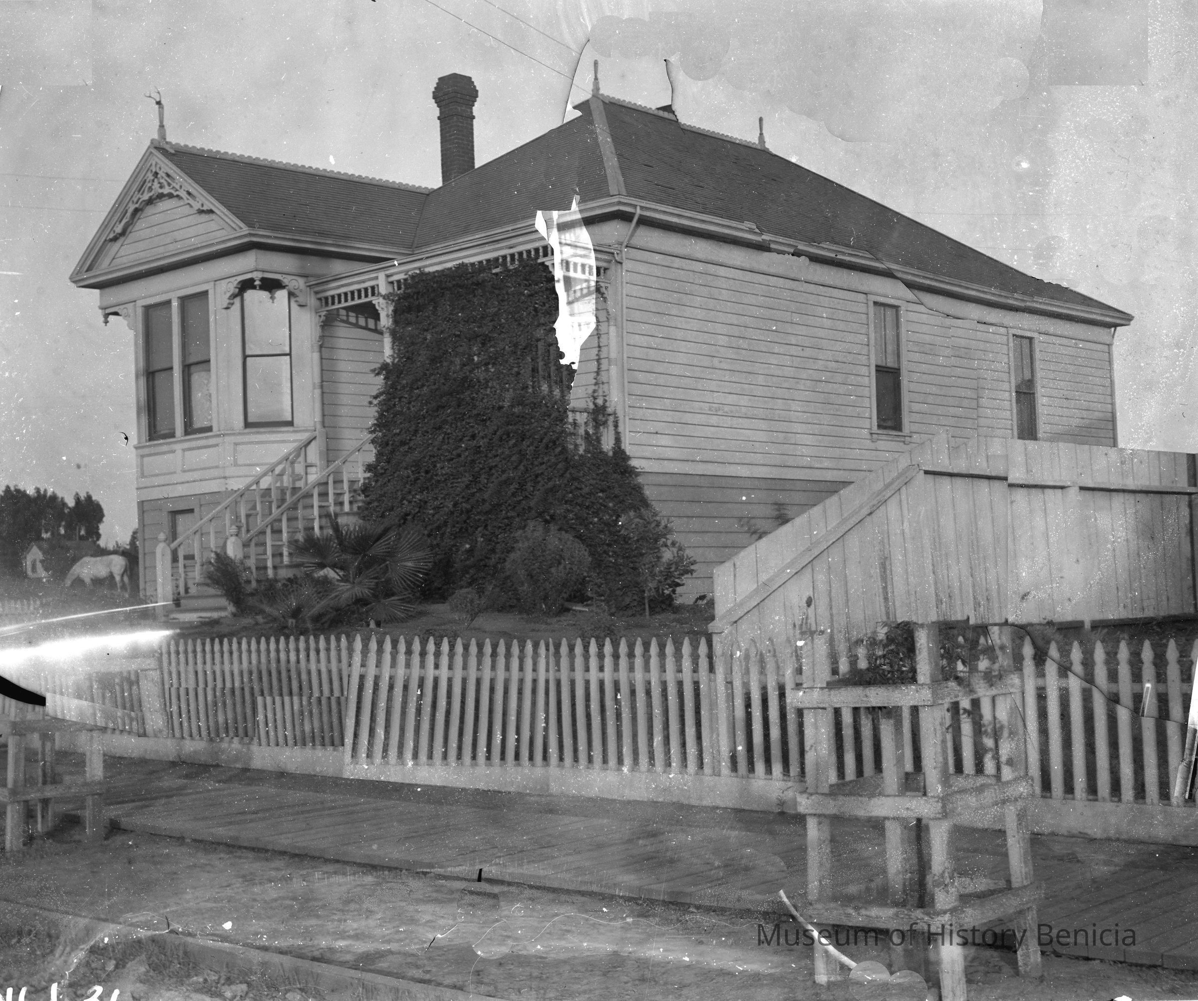 Image of a home with a picket fence. This is the same house that is shown in 2004.001.0030. The current address is 640 E 2nd street. The current owner is Harry Wassmann who is the third generation in his family to have owned this house. It was built about 1900 by a local contractor named McDonald for Patrick and Ellen Leary. Next to the house is a field with a horse grazing.Collection