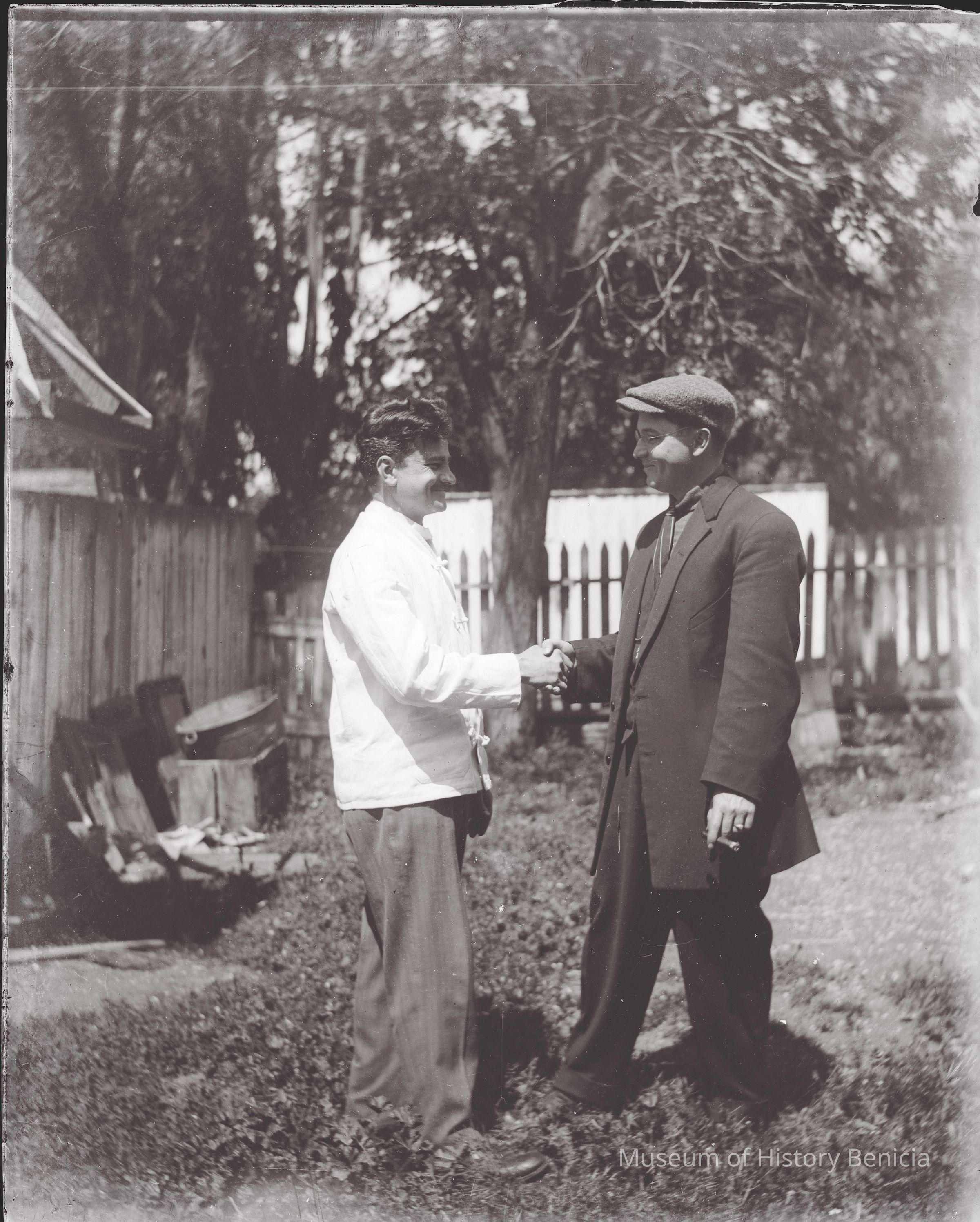 This photo shows John Molfino and a friend. John is wearing a white coat that he would wear when in his barber shop. The friend is smoking a cigar.Collection