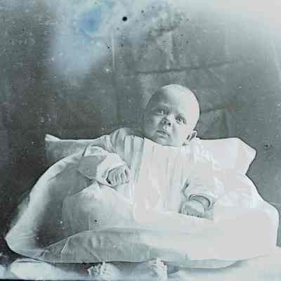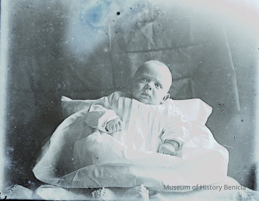 This looks like a postmortem photo. The baby is photographed without any supports to keep it from moving. The arms and hands are free.Collection