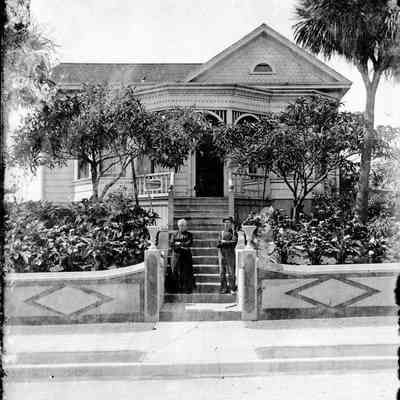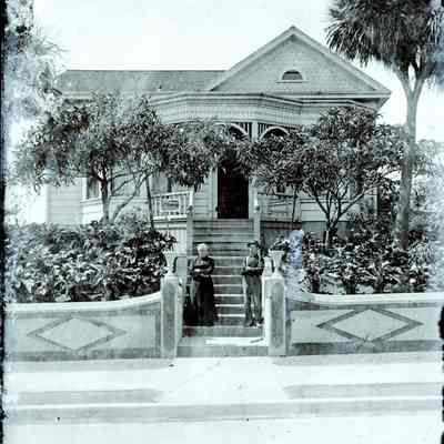 This shows a photo of a house at 172 East G Street with the owners standing on the steps behind a decorated concrete wall. It is the same house as shown in 2020.012.0112.Collection