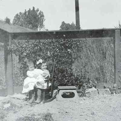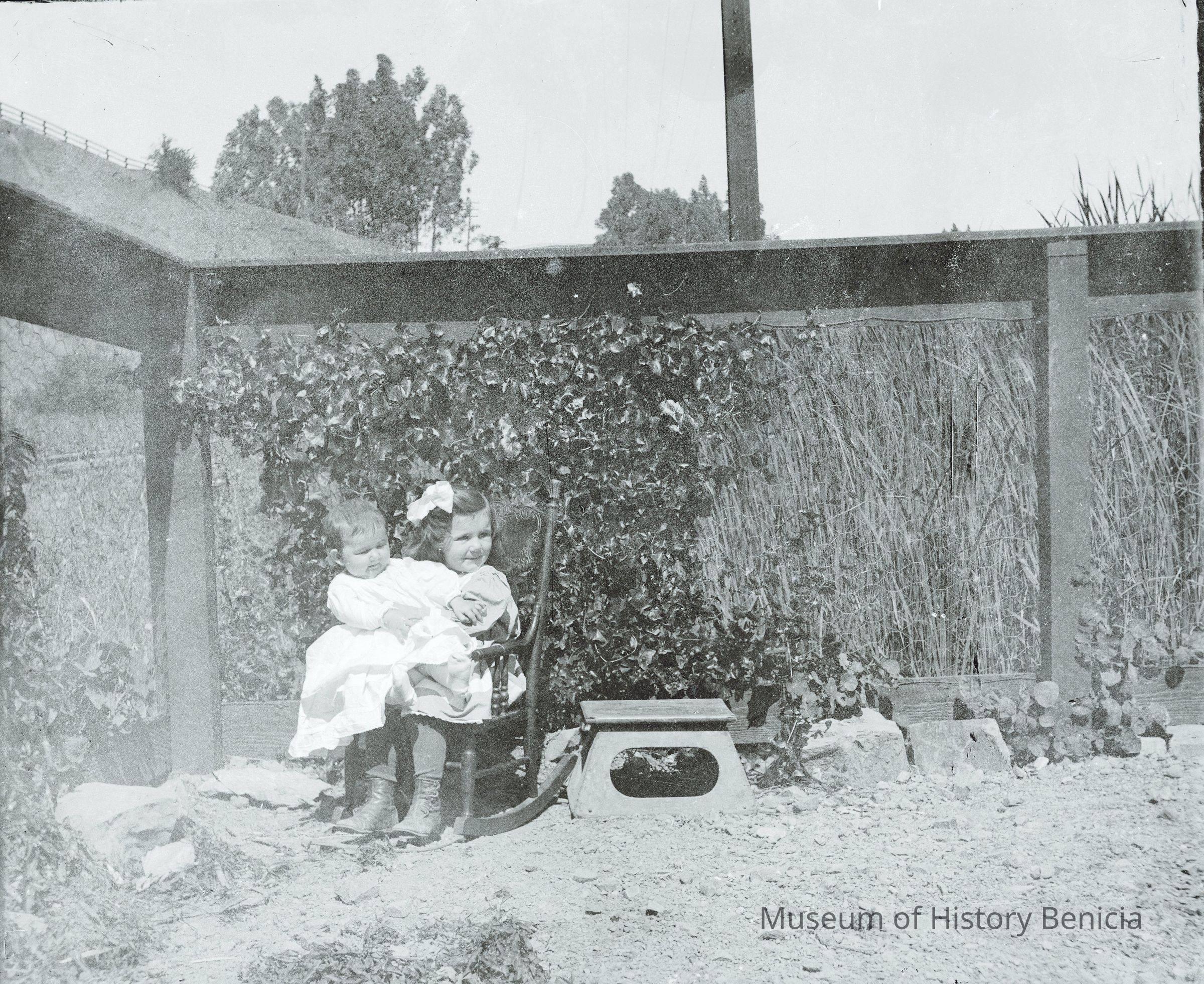 This photo shows a young girl in a rocking chair holding a baby. These same children are shown in 2020.012.0115 with other members of their family.Collection