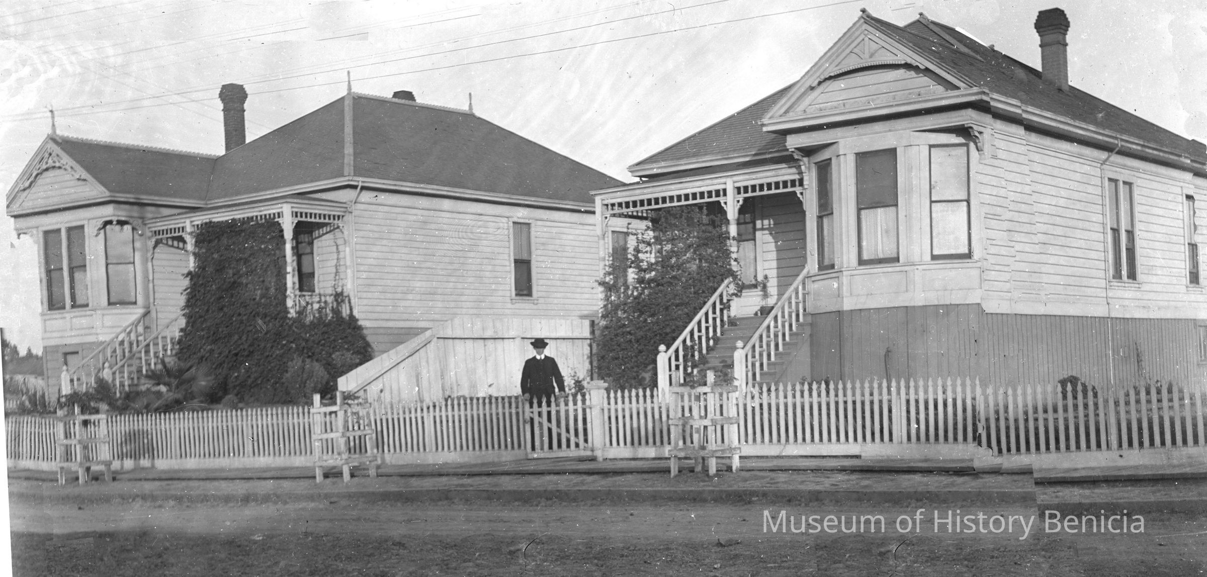 A scene of a fence and stairs surrounded by buildings. The buildings are two Queen Anne style houses that are almost mirror images of each other. The one on the left is at 640 E 2nd street and the other one is at 622 E 2nd street. There is a man standing in front of the house on the right. (Per Harry Wassmann, the Molfino's rented the house at 622 at one time. The houses were built by a local contractor about 1900 for Patrick and Ellen Leary. The one at 622 being for an aunt and uncle of Harry's. The man may be John Molfino.) There is a field to the left of the second house.Collection