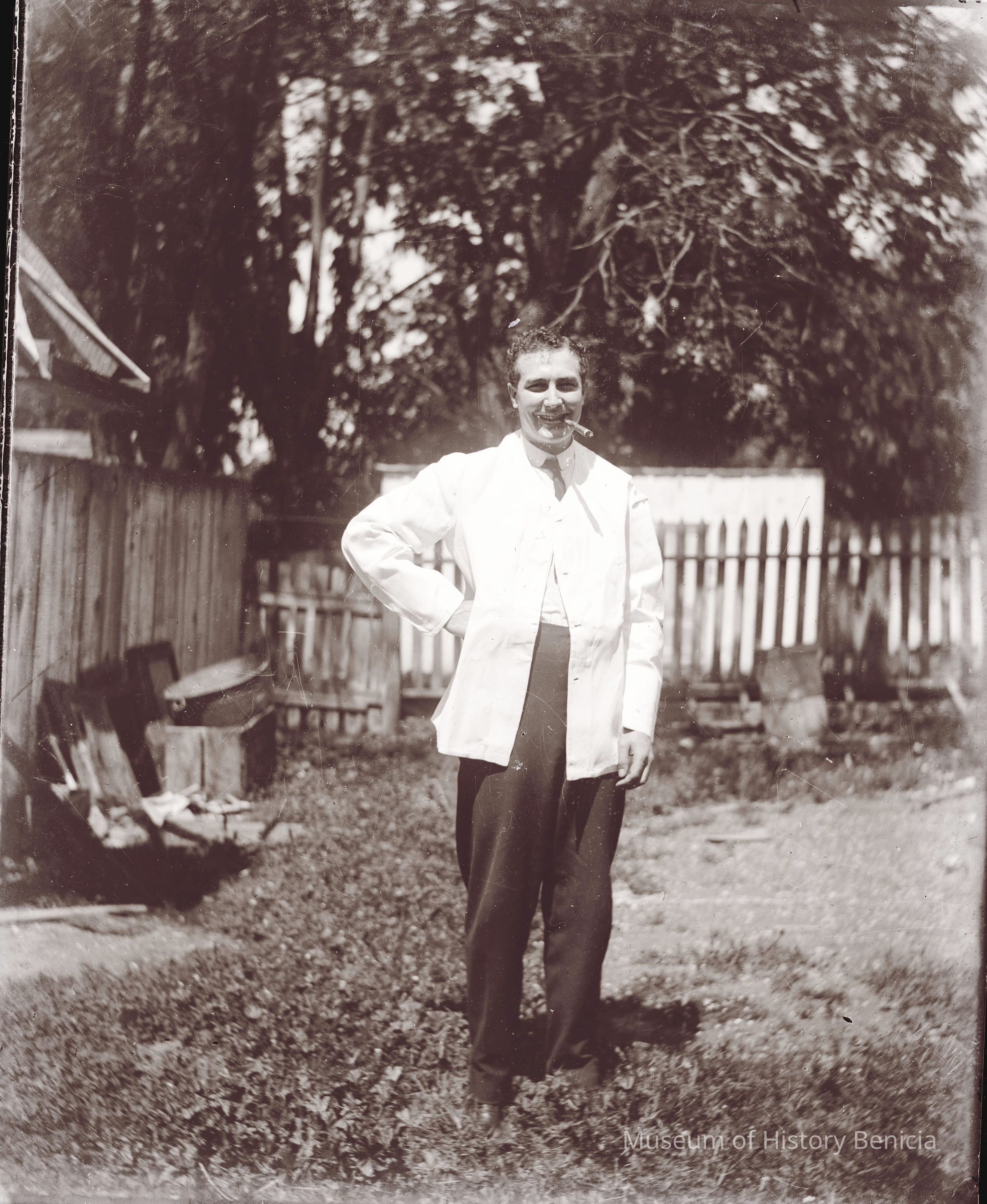 Man dressed in a barber's coat. This is probably one of the barbers working at John Molfino's barber shop.