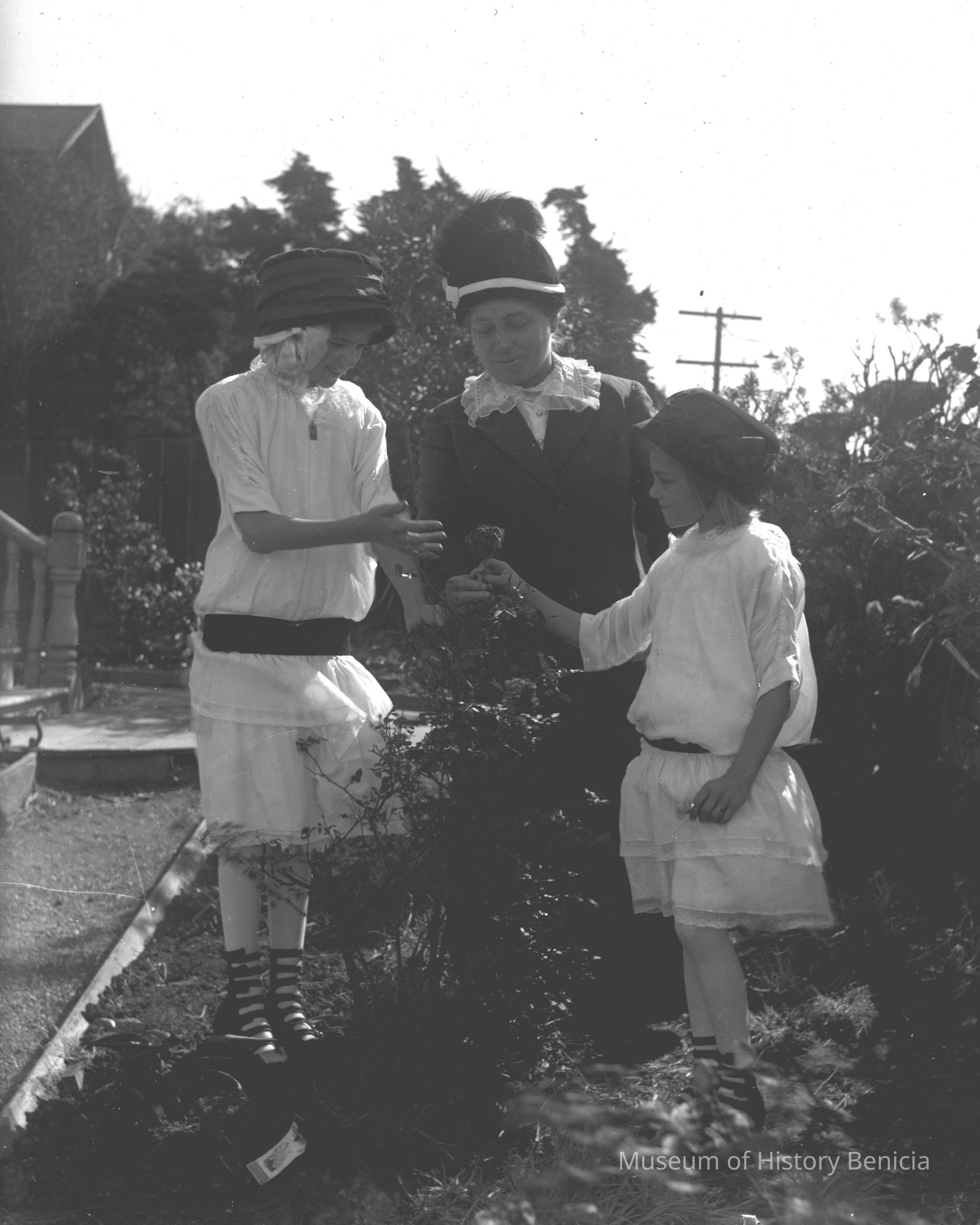 Mrs Molfino with two young girls in a garden.