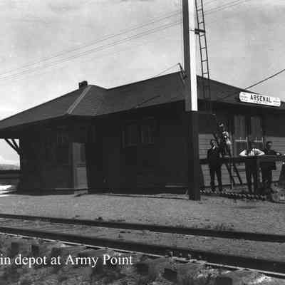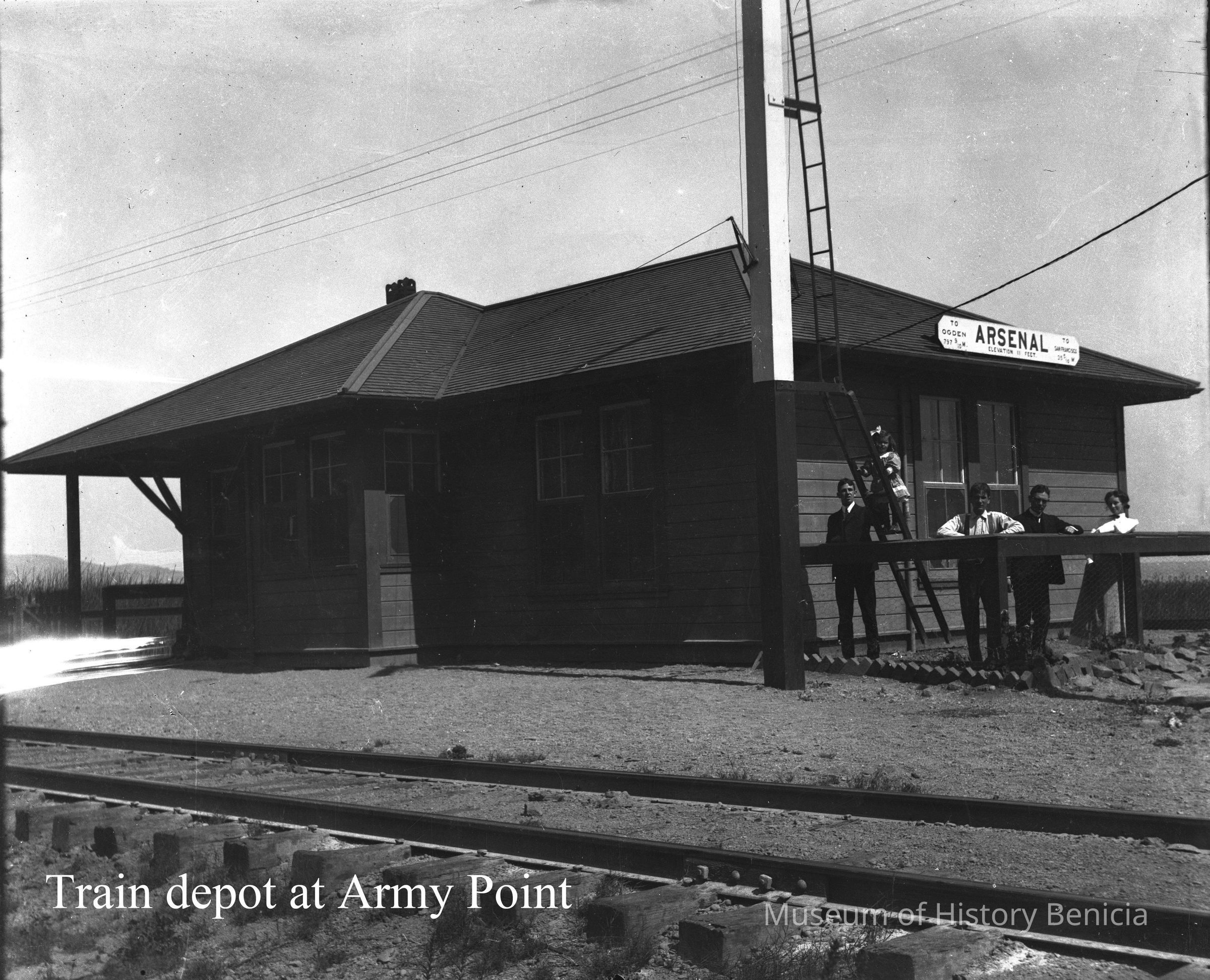 Three men a woman and a child standing outside a building in the Benicia Arsenal. The building looks like the Arsenal railroad station. It is next to the tracks, there is a sign giving the distance to Ogden Utah and San Francisco. The clothes worn by the people in the photo would likely date this photo to the early 1900s.Collection