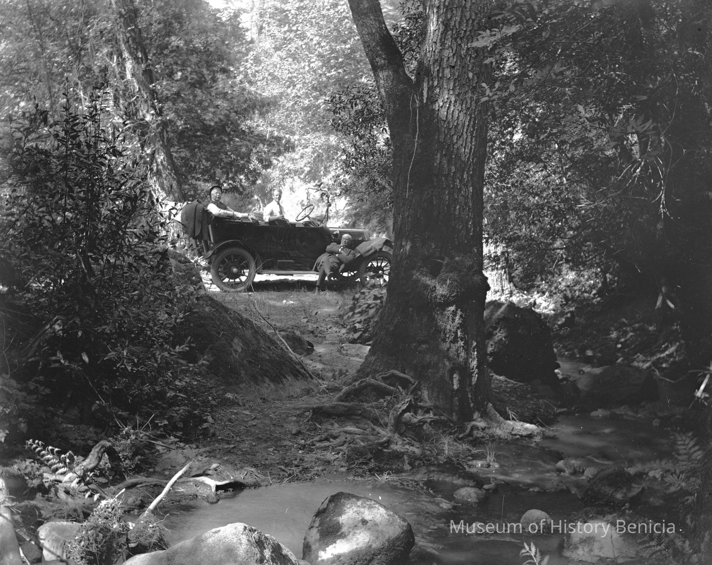 Mayor Crooks and two other men in a car in the woods. Looks like same car as in 360-363.