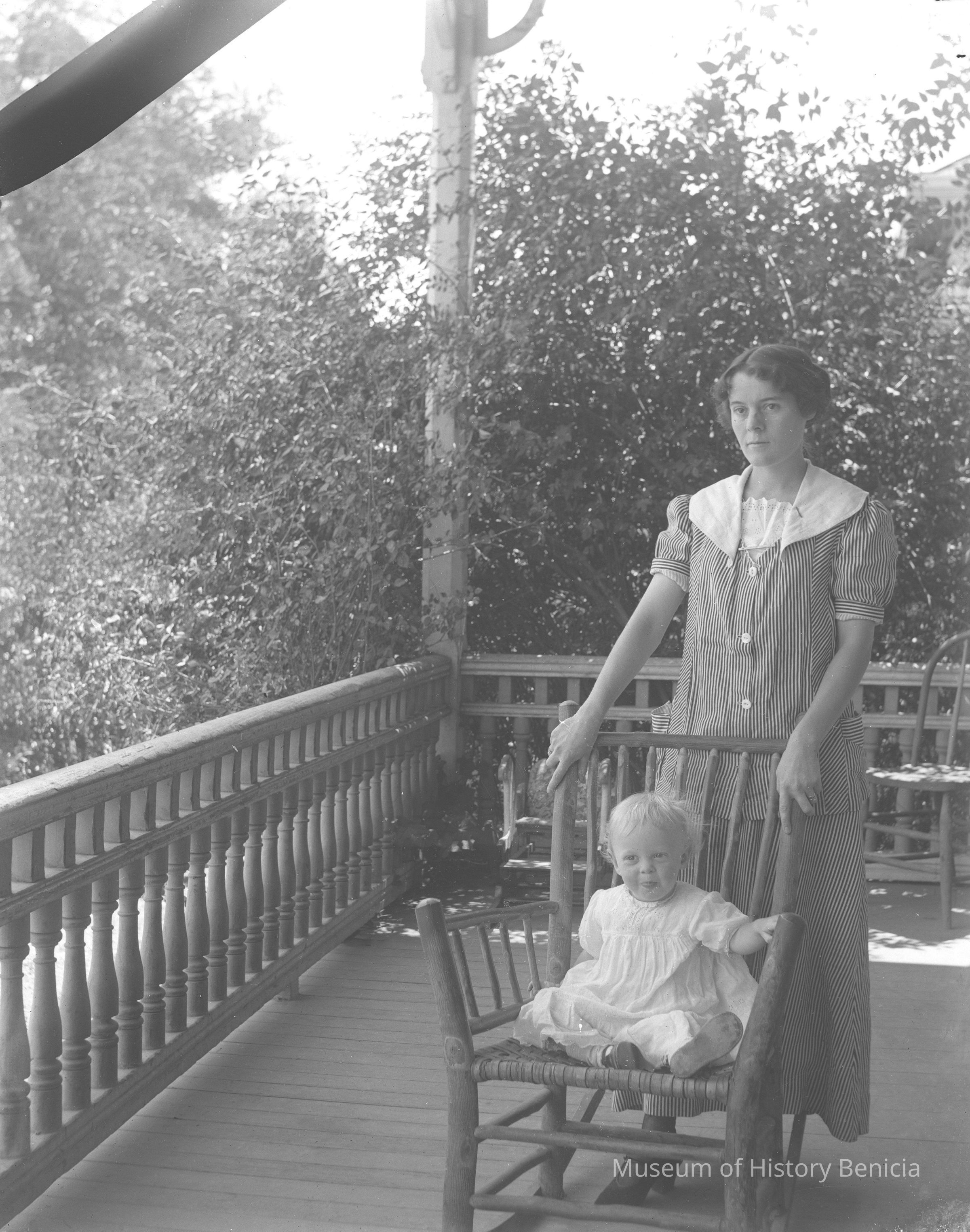 Unidentified woman with her hands on the back of a chair where a small child is sitting.