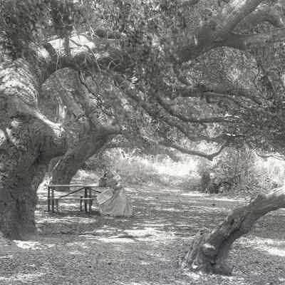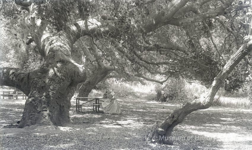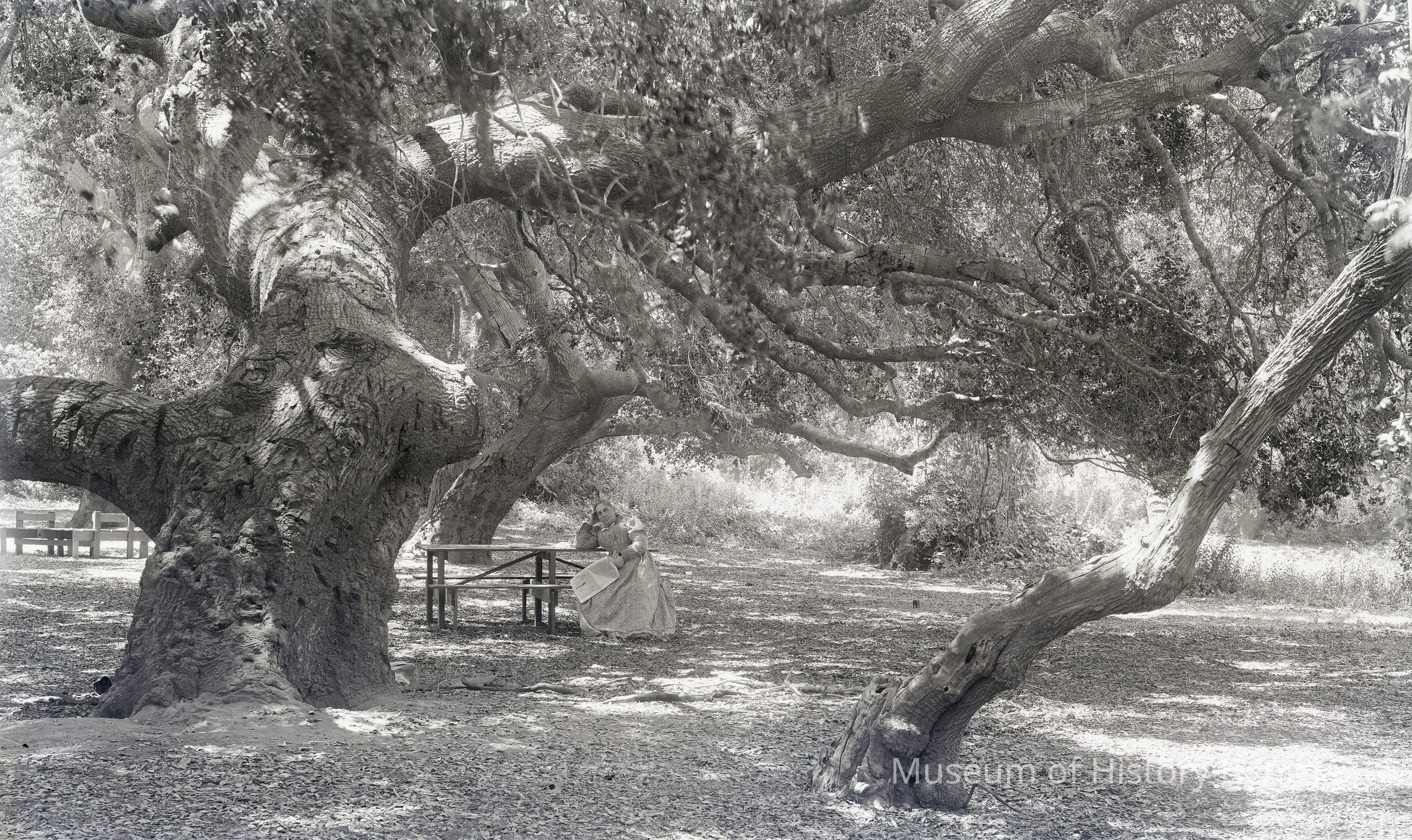 glass plate negative Shows an older woman with a newspaper sitting at a picnic table under a spreading tree.