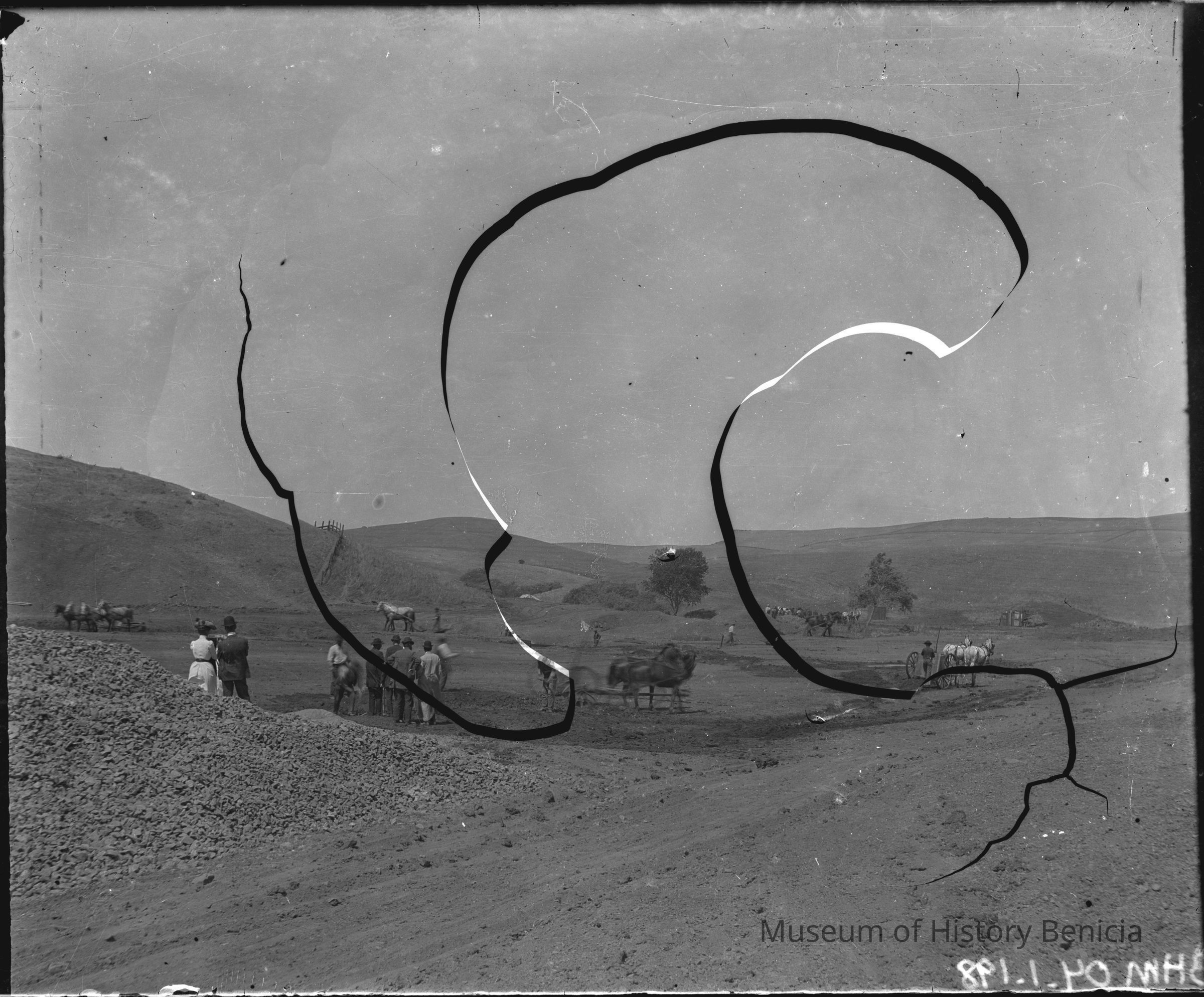 Emulsion on photo is peeling so had to scan it with the reverse side down. Looks like a group of workers building a road while others stand by and watch. This could be the building of Lake Hermann reservoir. There is a photo in the Benicia's Water Supply booklett (2010.017.0670) that looks very similar. If so, then this photo was taken in 1905.Collection