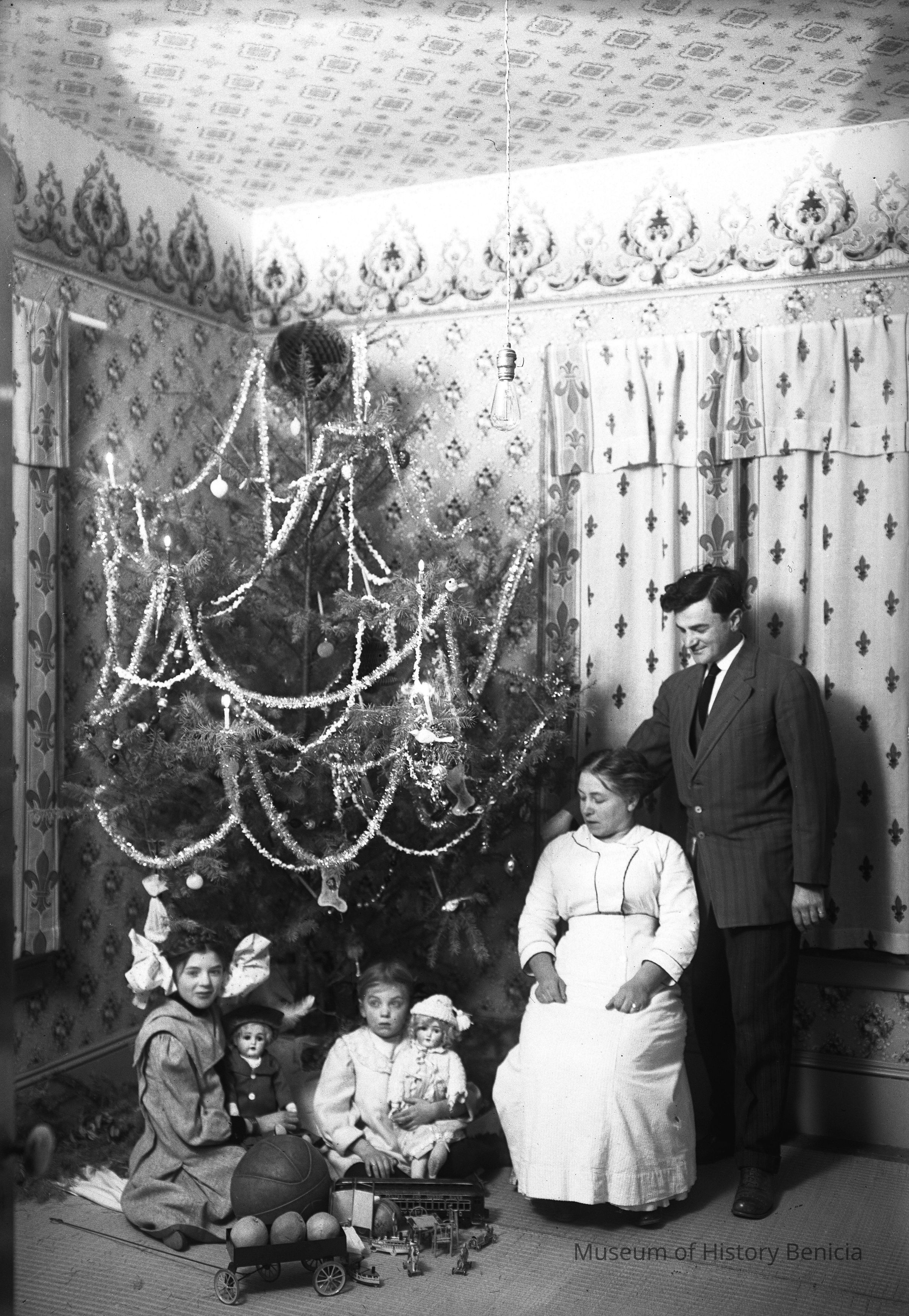 Looks like John Molfino, wife Dita (Giaconda) and his two girls Margurite and Violet. Christmas scene in front of the tree. Looks like a basketball, toy train, and movable toy ship, etc. as well as the dolls. Molfino's didn't have a boy???Collection