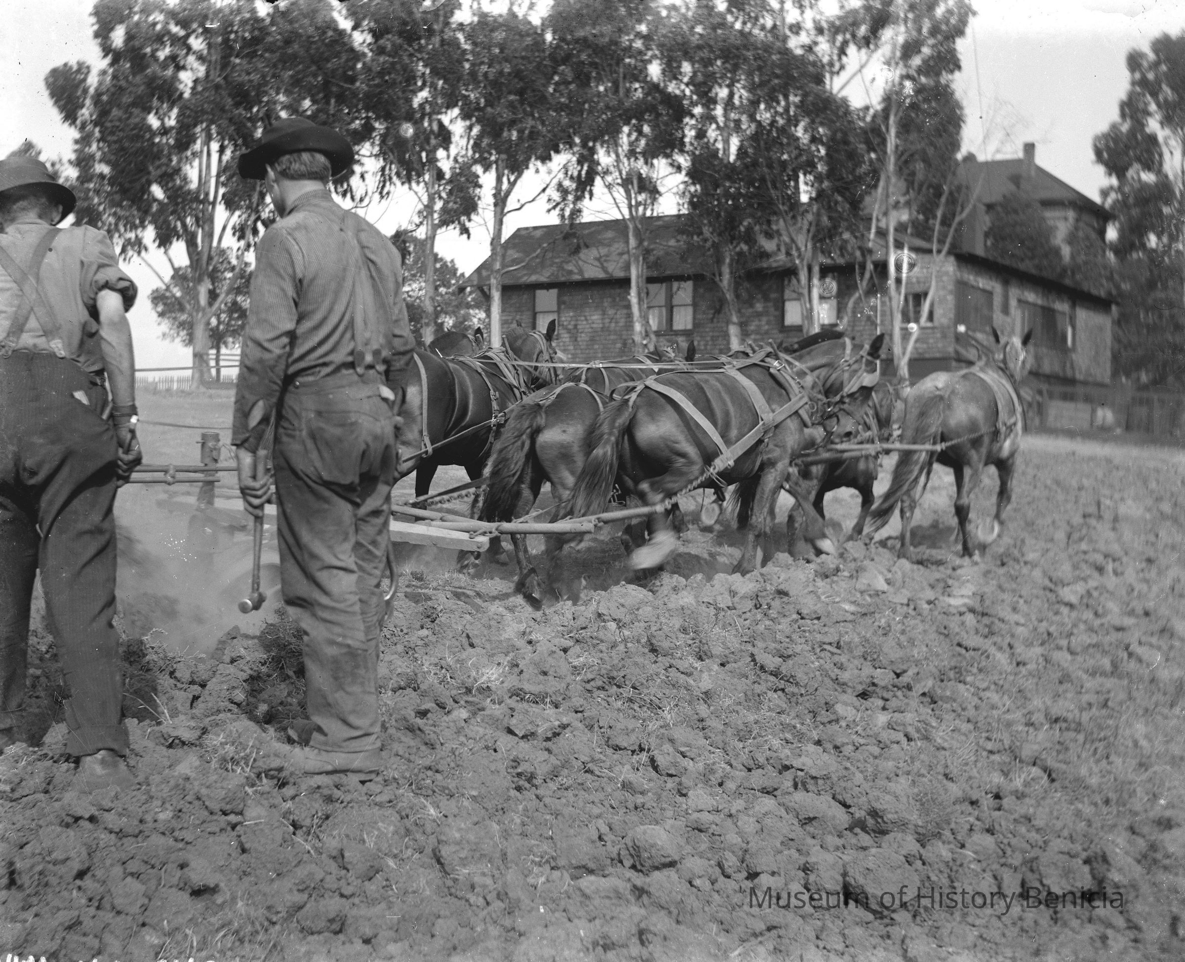 Horses plowing field.