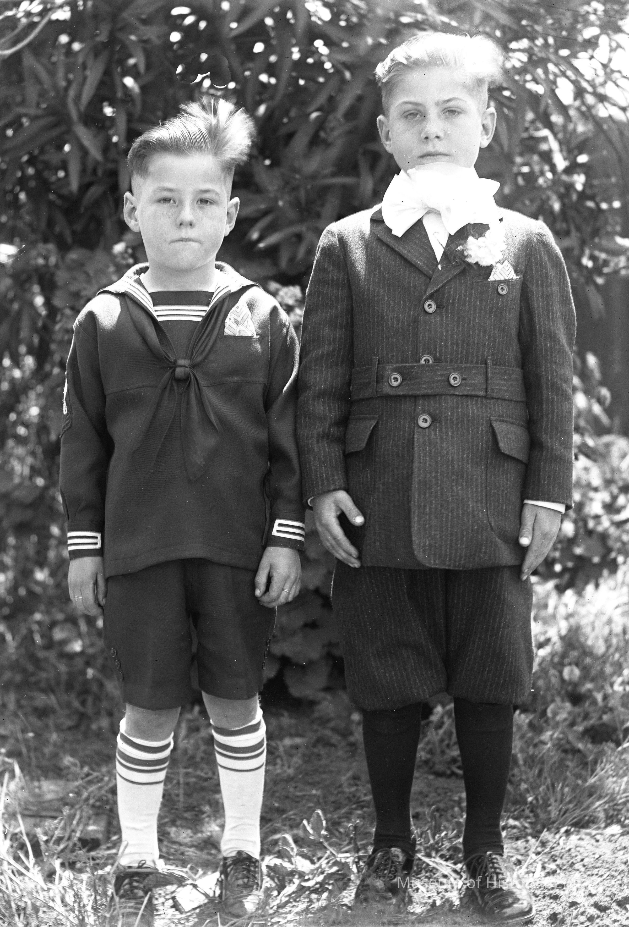 Two boys in a garden. One is in a sailor suit the other has a large bow.