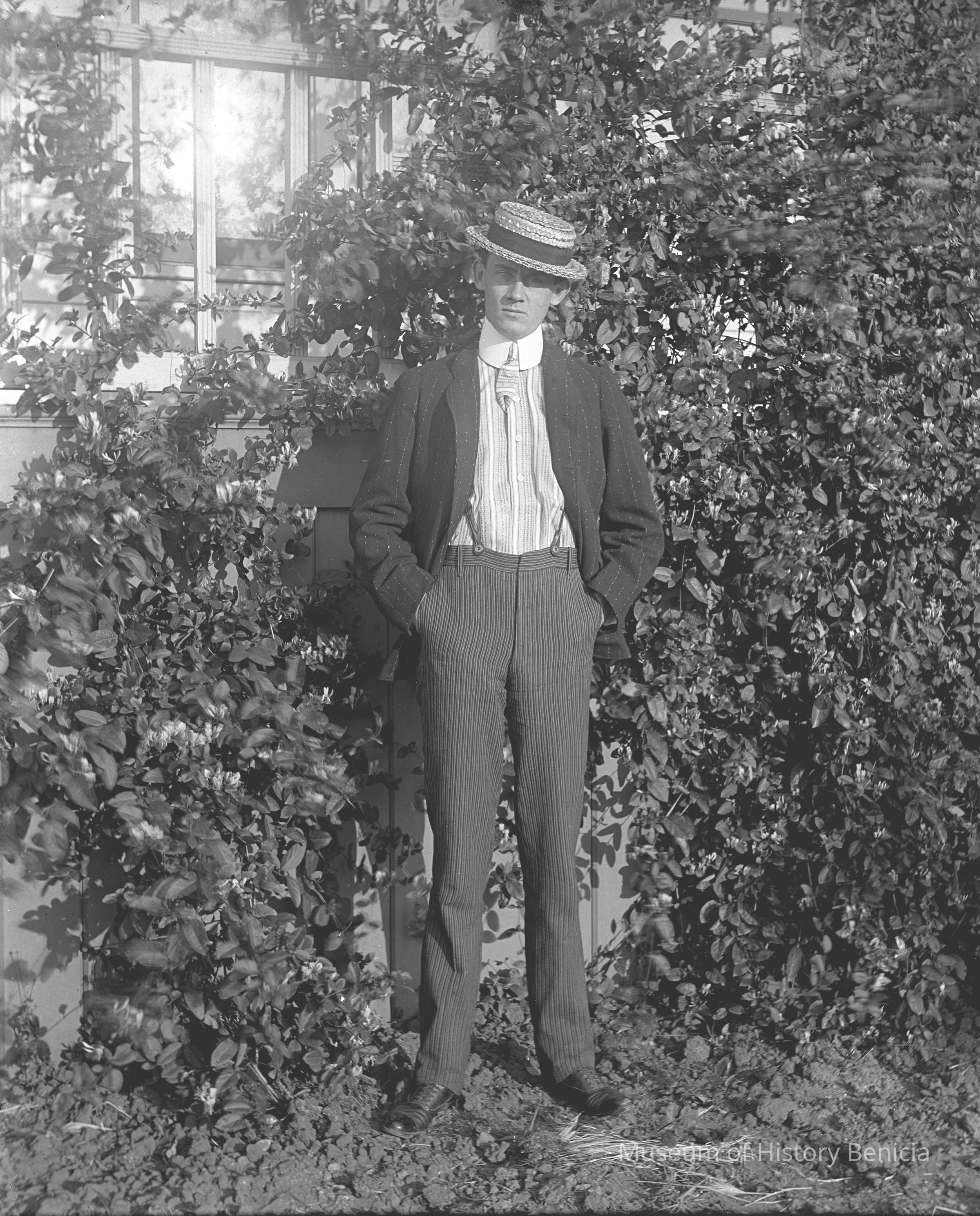Man in suit, stripped shirt and straw hat in garden next to house.