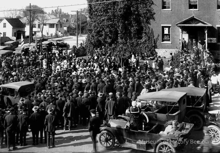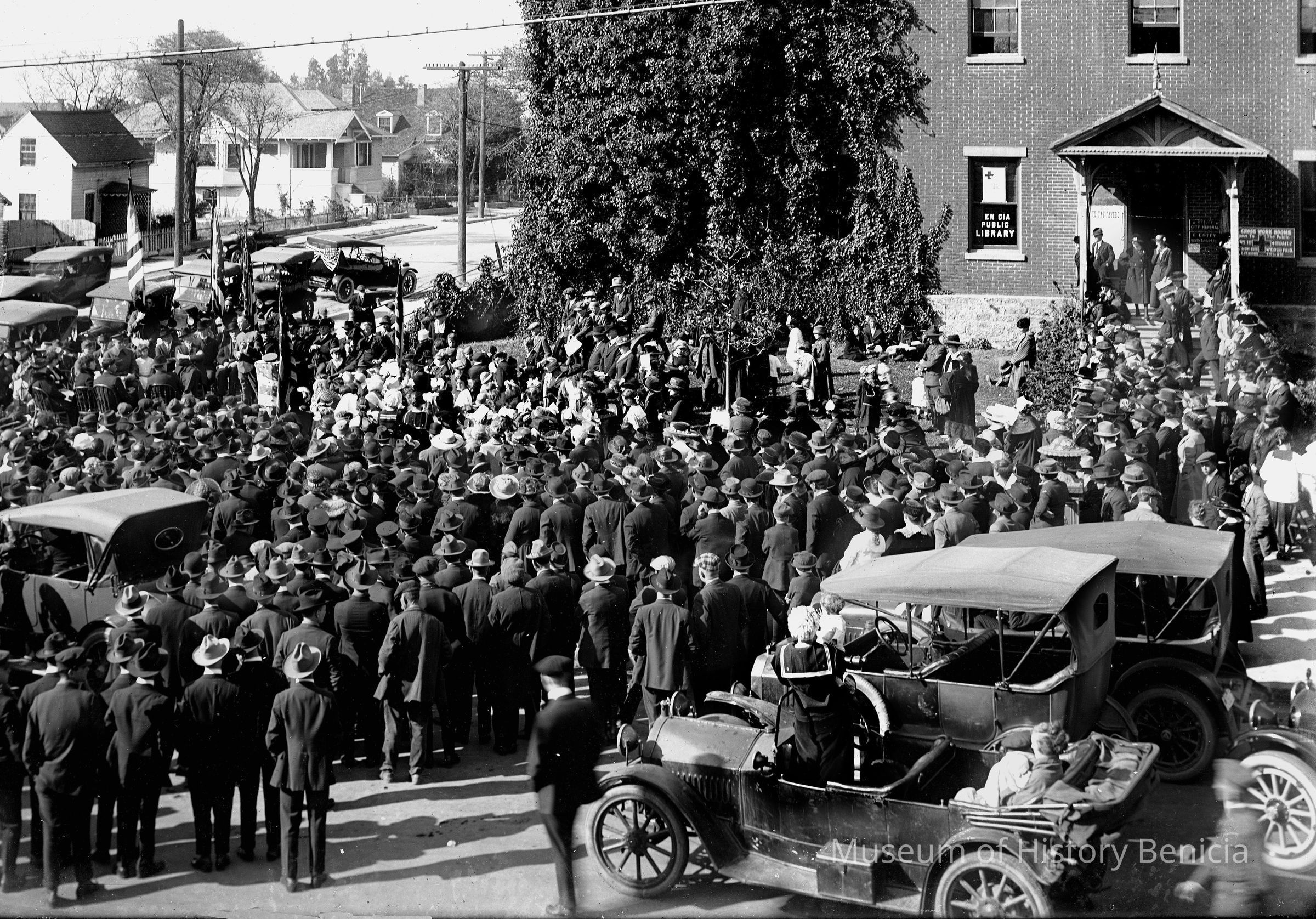 Large rally in front of the state capitol (then used for a library and city hall). Could be a political rally or one associated with the start of World War I.Collection