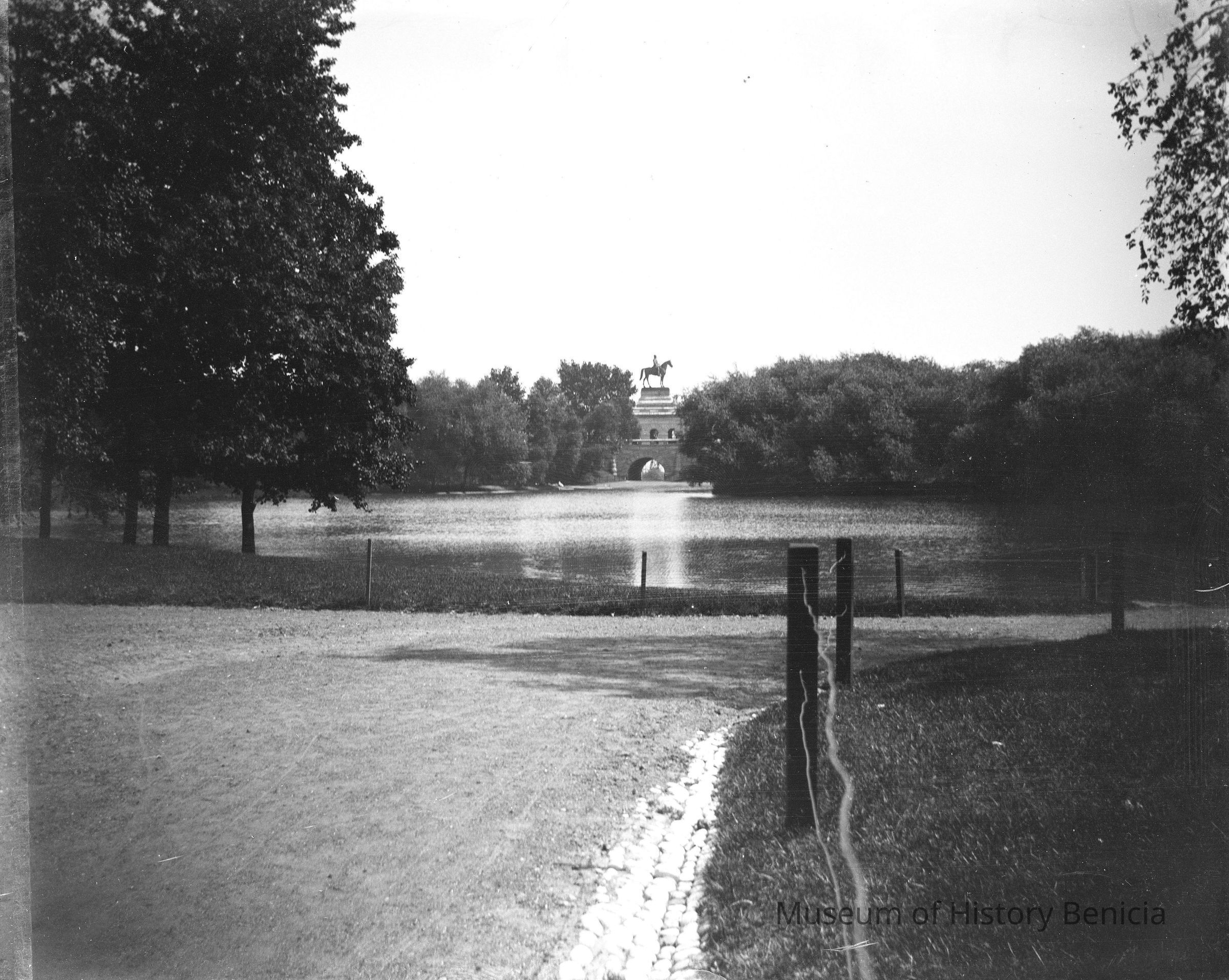 Unidentified monument; arched bottom, man on horse on top. Black and white negative. Lake with a man on horse statute in background. Probably the statue of Grant in Lincoln Park Chicago, Il.Collection