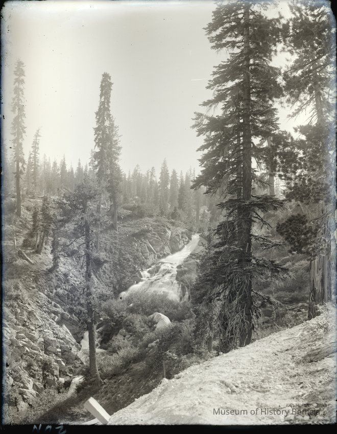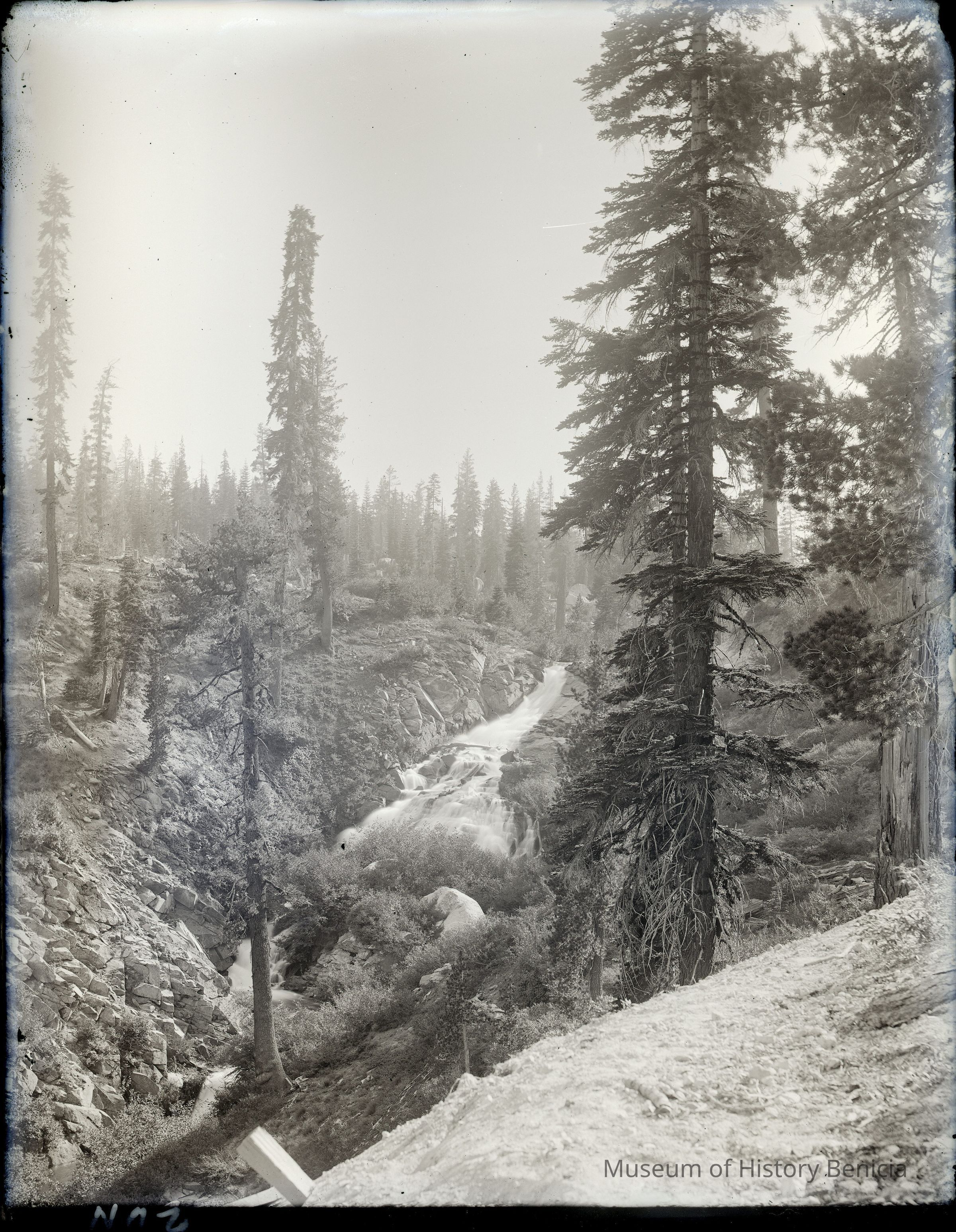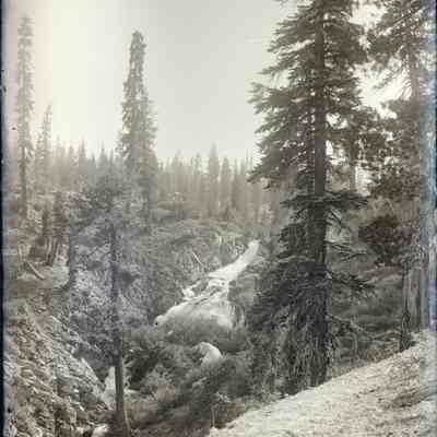 glass plate negative. Shows mountain stream and trees. Description from Nat'l Park Service ranger at Yosemite: unknown cascade